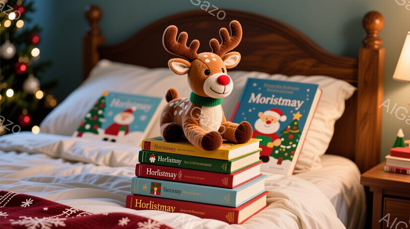 ベッドの上には、積み重ねられた本の上に置かれた、可愛らしい茶色のトナカイのぬいぐるみがあります。背景には、ぼんやりとクリスマスツリーが見え、暖かく、心地よい雰囲気を作り出しています。全体的に、読書やクリスマスをテーマにした、穏やかで居心地の良いシーンです。