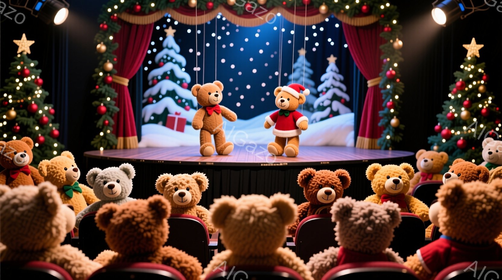 舞台の上には、赤いサンタの帽子をかぶった茶色のテディベアが立っており、もう一匹のテディベアは赤いハートが描かれた白い服を着ています。観客席には、様々な色のテディベアたちが座っており、舞台を見つめています。背景には雪景色とクリスマスツリーがあり、全体的に暖かく、お祝いの雰囲気です。