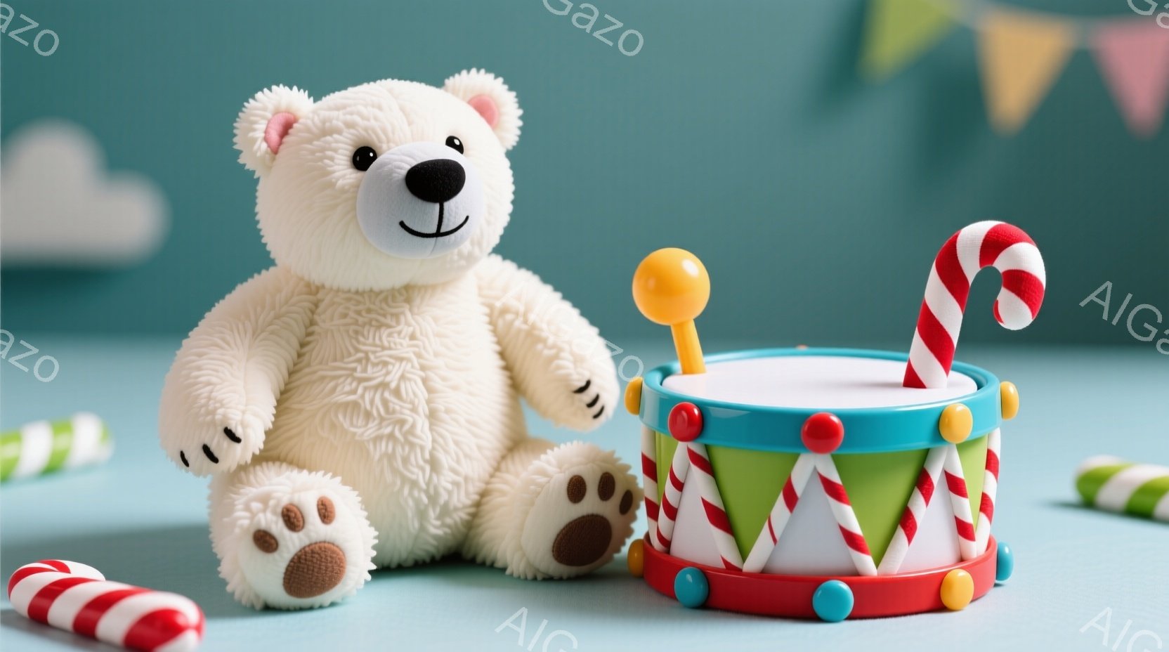白いテディベアが、カラフルなドラムとキャンディケーンに囲まれて座っています。ベアはふわふわしており、黒い鼻と足のパッドが特徴的で、愛らしい表情をしています。背景はぼやけており、おそらくクリスマスツリーの光がちらついており、お祝いの雰囲気を感じさせます。