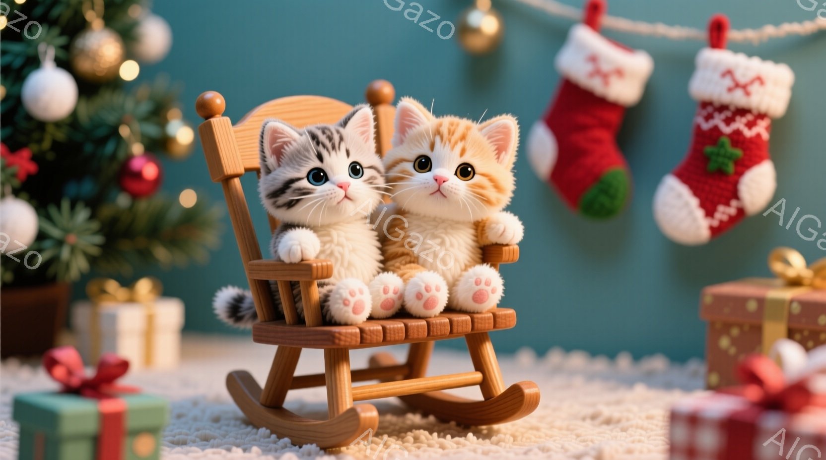 暖炉のそばに、ロッキングチェアに座った2匹の小さな子猫がいます。1匹はオレンジ色、もう1匹は縞模様で、どちらも丸い目でカメラを見つめており、可愛らしい表情をしています。背景にはクリスマスツリーやプレゼント、暖炉があり、温かく、お祝いの雰囲気が漂っています。