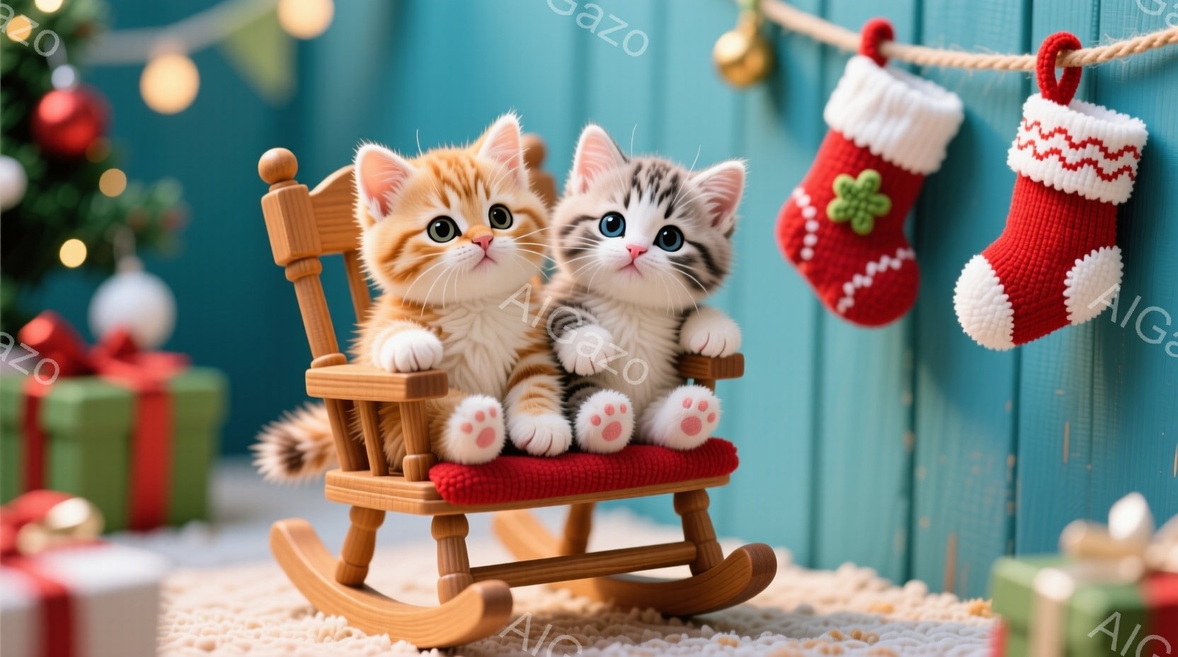 鮮やかなクリスマスを背景に、2匹の小さな子猫がロッキングチェアに座っています。一匹はオレンジと白のトラ柄、もう一匹はグレーと白のトラ柄で、どちらも大きな瞳でこちらを見ています。ロッキングチェアの周りにはプレゼントボックスやクリスマスソックスが置かれ、温かくお祝いムードに満ちた雰囲気です。