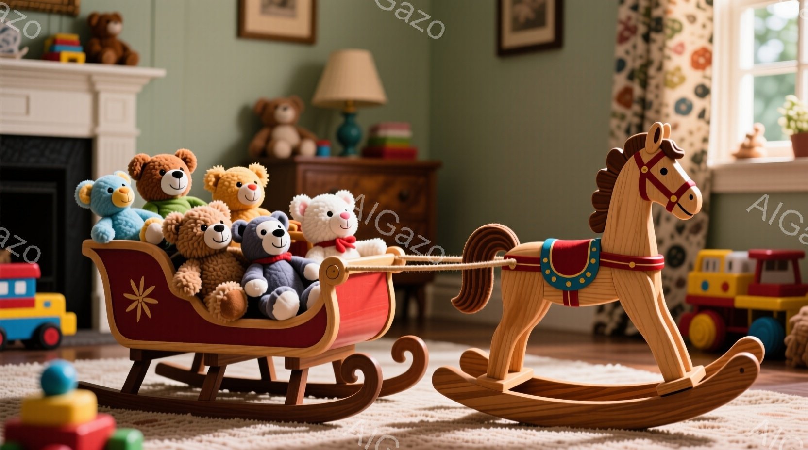 鮮やかな遊戯室で、ロッキングホースに赤いそりが結び付けられ、中に複数のテディベアが座っています。背景にはおもちゃが並んだ棚と、窓から差し込む柔らかな光があり、暖かく、遊び心に満ちた雰囲気を醸し出しています。全体的に、子供時代の思い出や温かい家庭の情景を想起させる、穏やかで心地よいイメージです。
