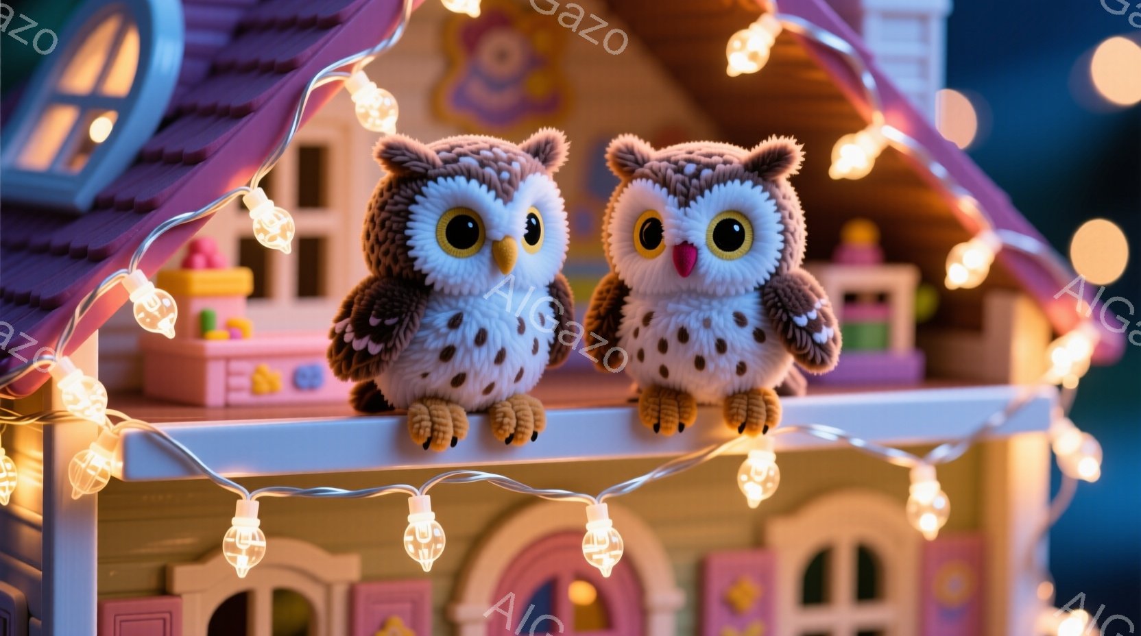 ふわふわのフクロウのぬいぐるみ2匹が、おもちゃのような家の屋根の上に並んで座っています。背景にはカラフルなプラスチック製の家が続き、暖かい光のイルミネーションが屋根を飾っています。全体的に、可愛らしく、温かみのある、お祭りや遊び心を感じさせる雰囲気です。