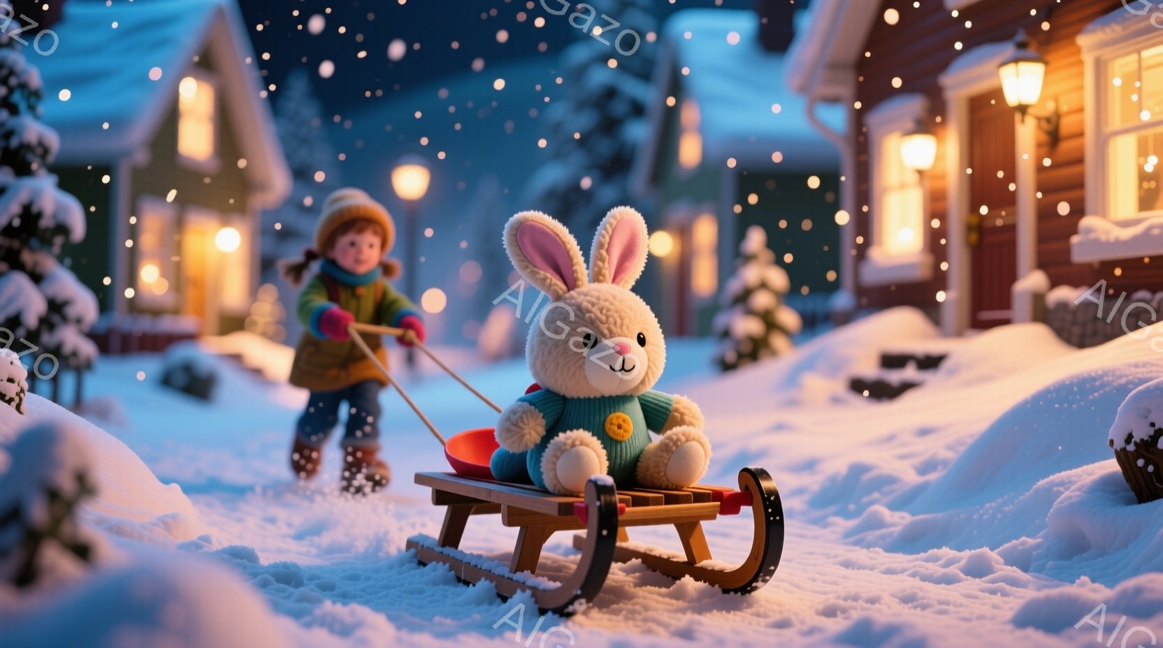 雪景色の中で、幼い少年が大きなぬいぐるみのウサギをソリで引いています。少年は緑色のジャケットと黄色の帽子をかぶり、頬を赤らめて楽しそうにソリを引いています。背景には温かい光が灯る家々が並び、雪が降り積もる幻想的な冬の雰囲気が漂っています。