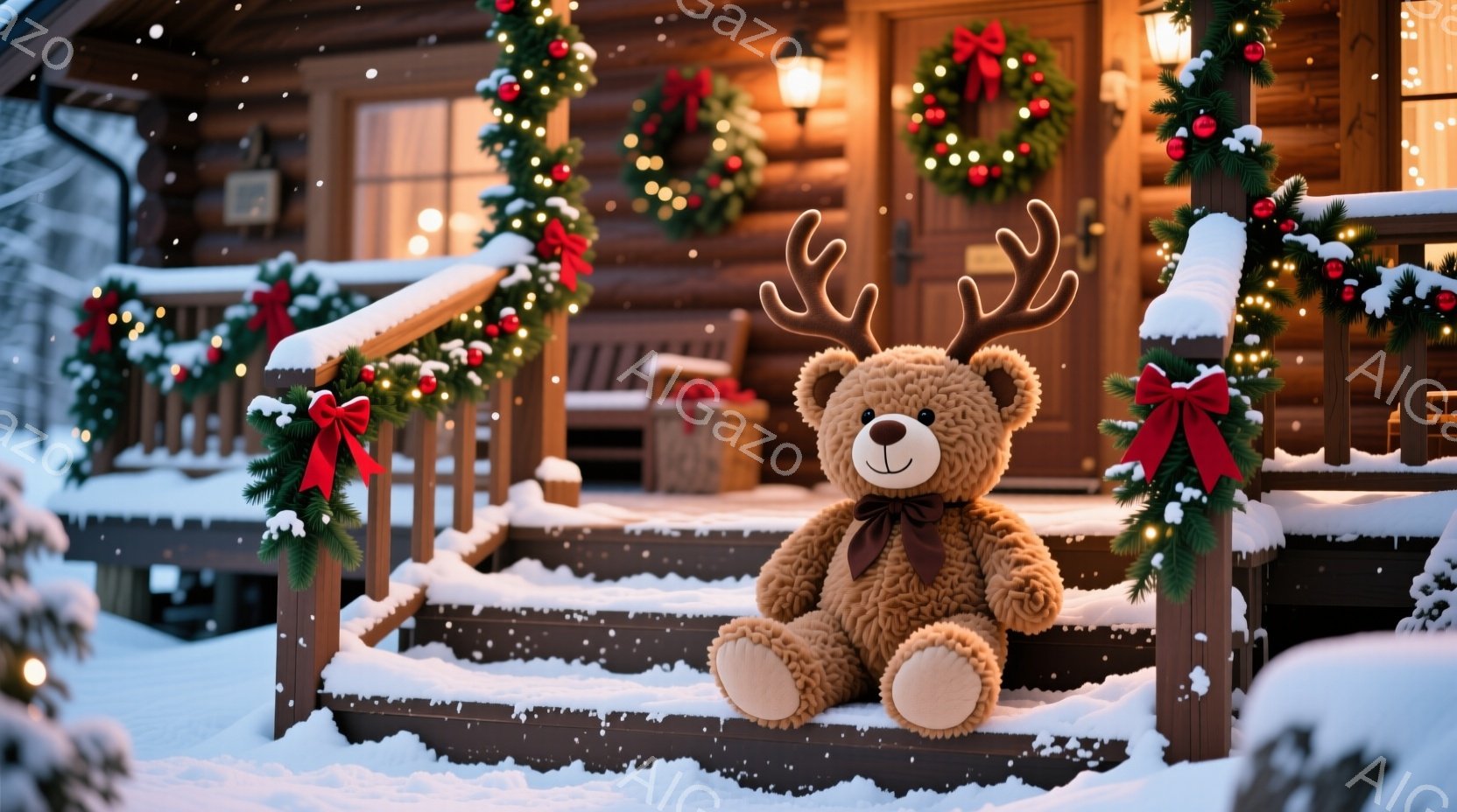 雪が降る中、木の階段に座ったテディベアが写っています。テディベアは茶色で、赤いリボンと角のついた帽子をかぶっており、親しみやすい表情をしています。背景には、クリスマスリースや装飾が施された木製の家があり、暖かく、お祝いムードの冬の風景です。