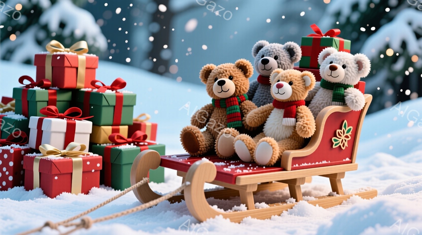 雪景色の中に、赤いそりに3匹のテディベアが座っています。茶色、クリーム色、そして濃い茶色のクマたちはそれぞれ緑や青のセーターを着ており、嬉しそうな表情をしています。そりの周りにはカラフルなギフトボックスの山が積み上げられており、クリスマスの暖かく楽しい雰囲気を醸し出しています。