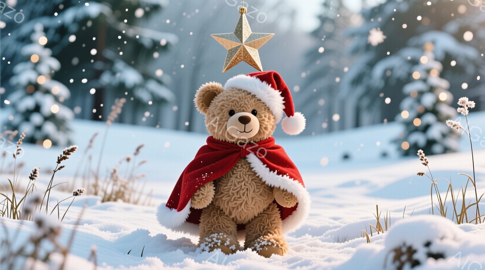 ふわふわの茶色のテディベアが、白い雪の上に立っています。赤いサンタの帽子とマントを身に着け、頭上には金の星が輝いています。背景には雪をまとった木々があり、冬の幻想的な雰囲気を醸し出しています。
