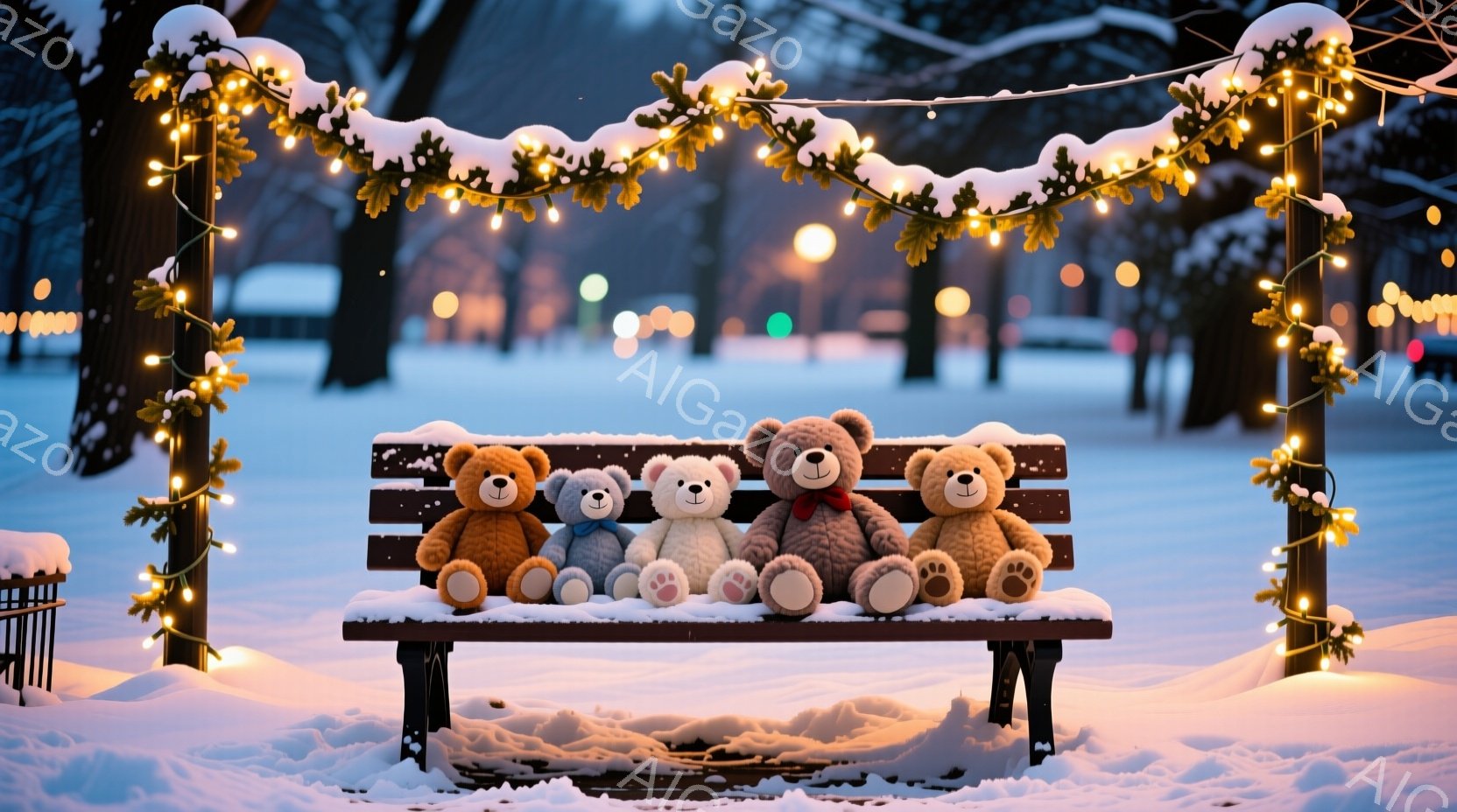 雪に覆われた公園のベンチに、四匹のテディベアが並んで座っています。ベンチと周囲の木々は、温かい光を放つクリスマスライトで飾られており、冬の静寂と温かい雰囲気を醸し出しています。背景にはぼんやりと建物が見え、雪景色が広がり、クリスマスの魔法のような雰囲気が漂っています。