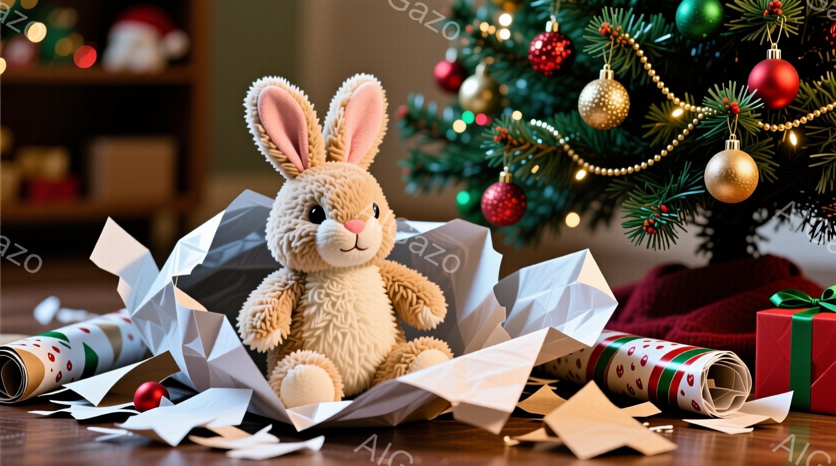 茶色のふわふわのウサギのぬいぐるみがお祝いの紙に包まれて床に置かれています。背景には、クリスマスツリーが飾られ、赤い布とプレゼントの箱が置かれています。全体的に、ホリデーシーズンを象徴する温かく、お祝いの雰囲気です。