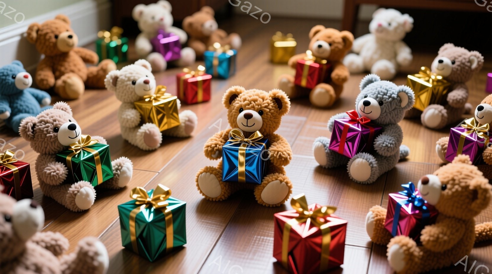 この無料AI生成画像「鮮やかな色のラグの上に座ったふわふわのテディベアが、緑と赤のギフトボックスを抱えています。背景には、カラフルなおもちゃと、床に座って遊んでいる幼い子供たちが二人います。全体的に、暖かく、遊び心のある、家庭的な雰囲気が漂っています。」は、2025年10月25日に作成されました。 サイズは 1664×928px の高解像度で、商用利用も可能なフリー素材として提供しています。