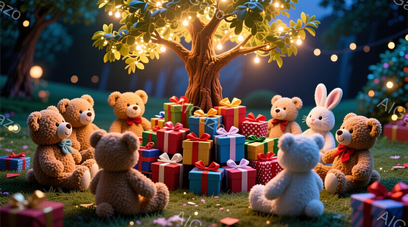 柔らかい毛並みのテディベアとウサギが、クリスマスのプレゼントの山を取り囲んで座っています。背景には、輝くイルミネーションで飾られたクリスマスツリーがあり、緑の芝生の上には赤い葉が散らばっています。全体的に、温かく、お祝いムードに満ちたクリスマスの光景が表現されています。