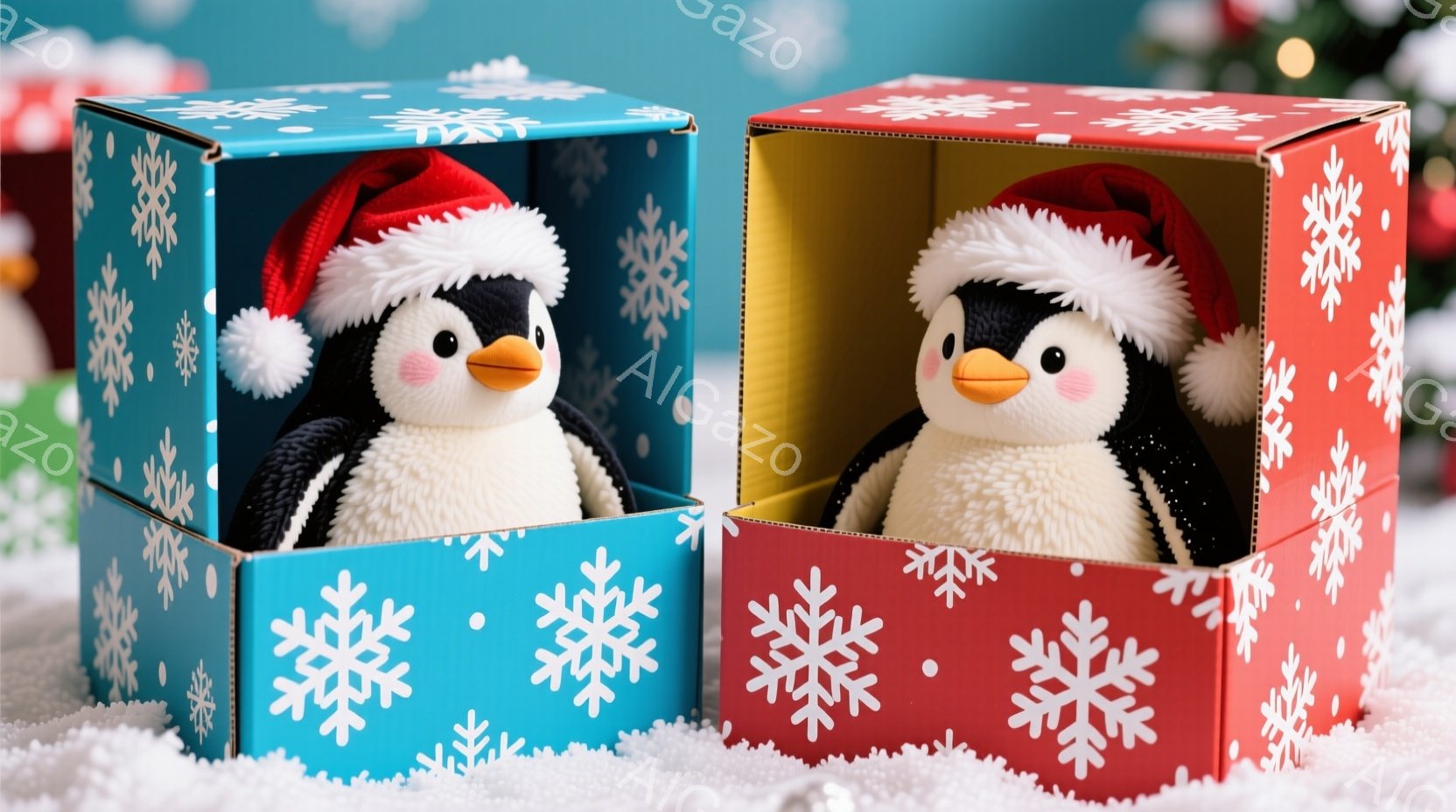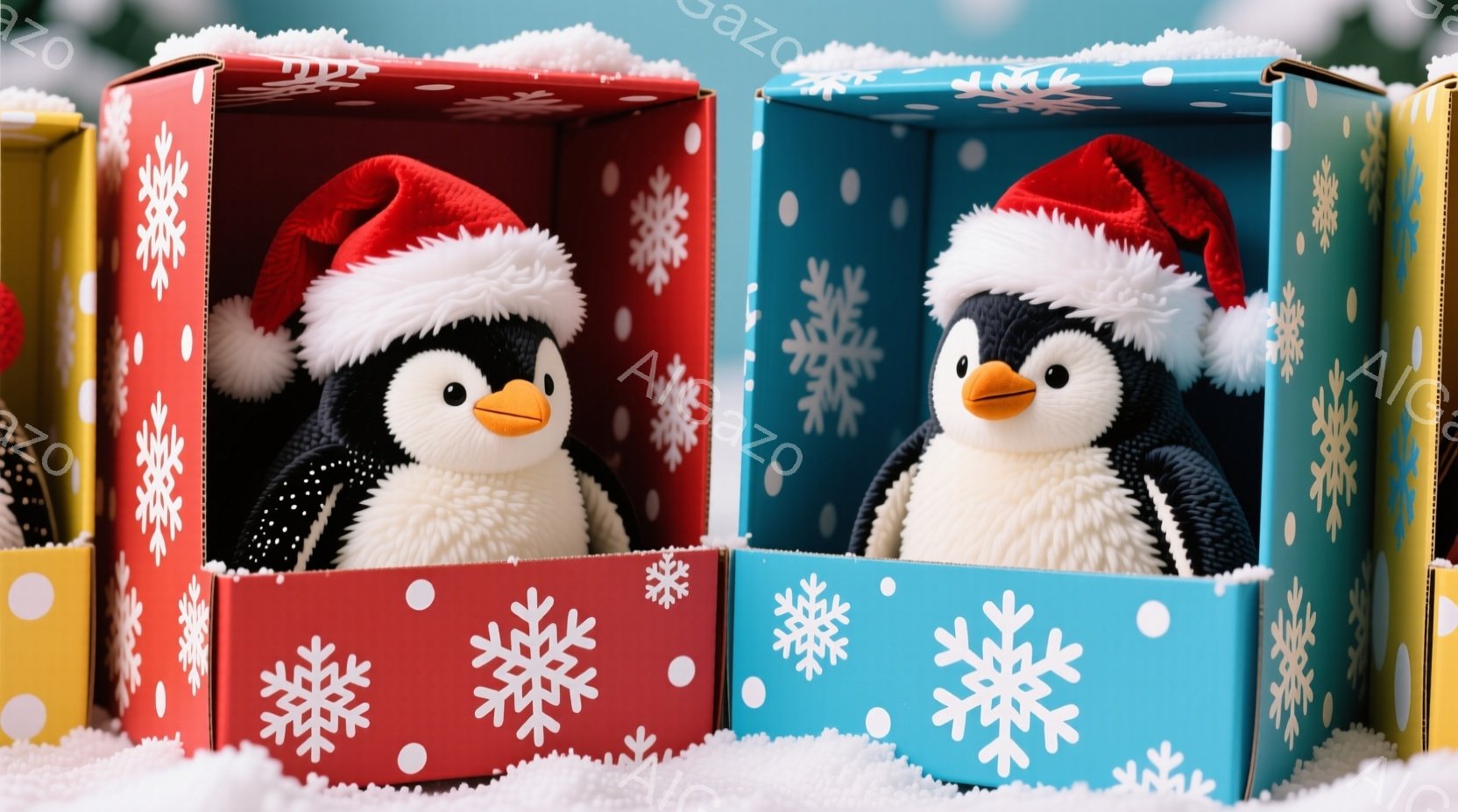 複数のペンギンのぬいぐるみたちが、それぞれ異なる色のギフトボックスから顔を出しています。ペンギンたちは赤いサンタの帽子をかぶり、つぶらな瞳とオレンジ色のくちばしが特徴的で、可愛らしい表情をしています。背景には雪が積もり、全体的に暖かく、クリスマスの雰囲気が漂っています。