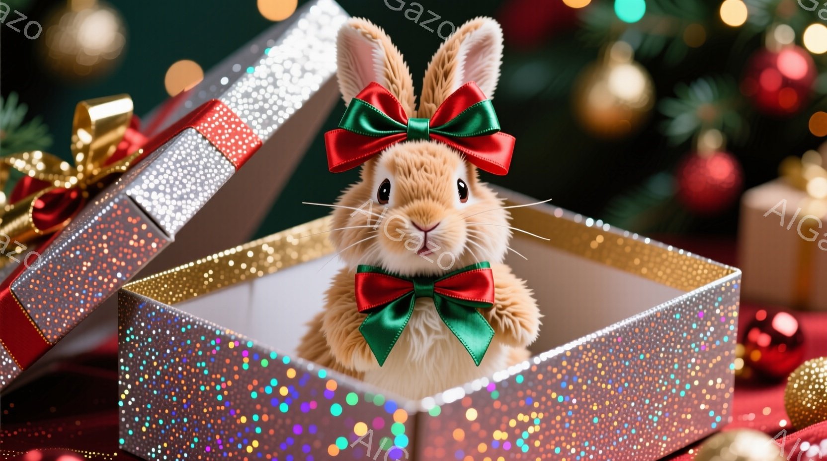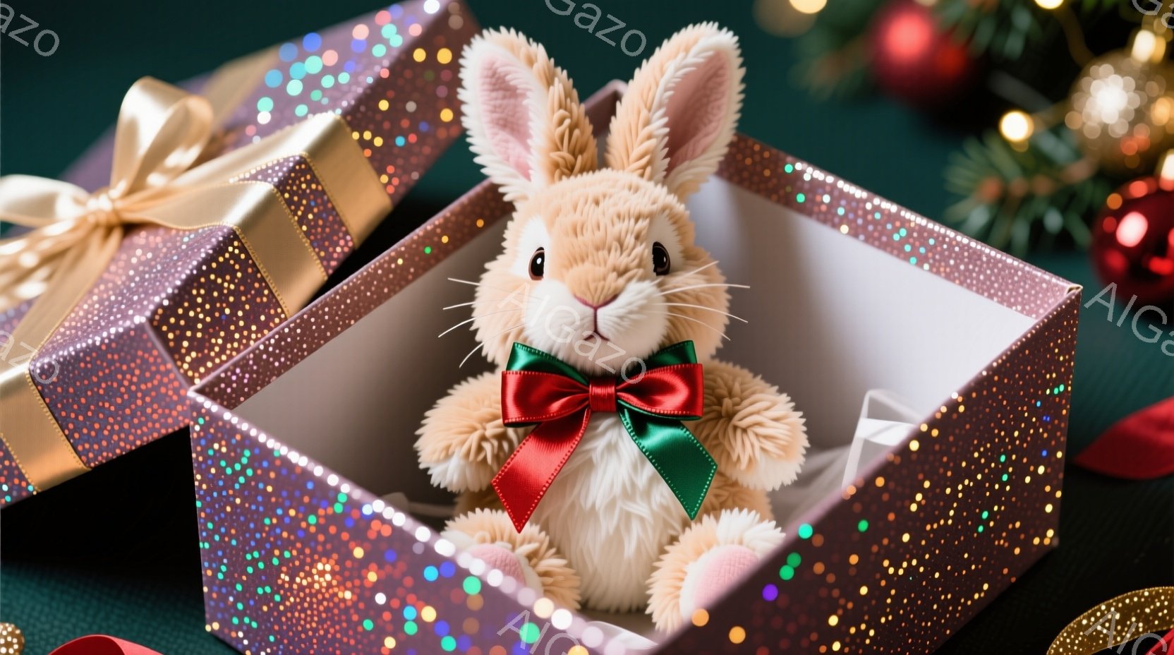 この無料AI生成画像「鮮やかなピンク色のグリッターで覆われたギフトボックスの中に、可愛らしいオレンジ色のうさぎが座っています。赤いリボンを首に結び、正面を見て少し緊張した表情をしています。背景には、金色のオーナメントや緑色の植物が散りばめられており、お祝いムードを演出しています。」は、2025年10月25日に作成されました。 サイズは 1664×928px の高解像度で、商用利用も可能なフリー素材として提供しています。