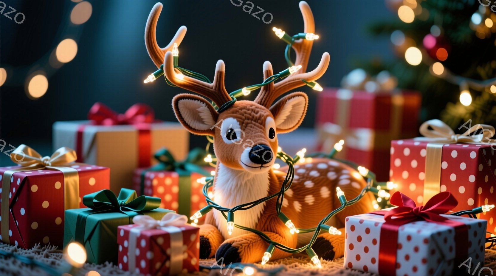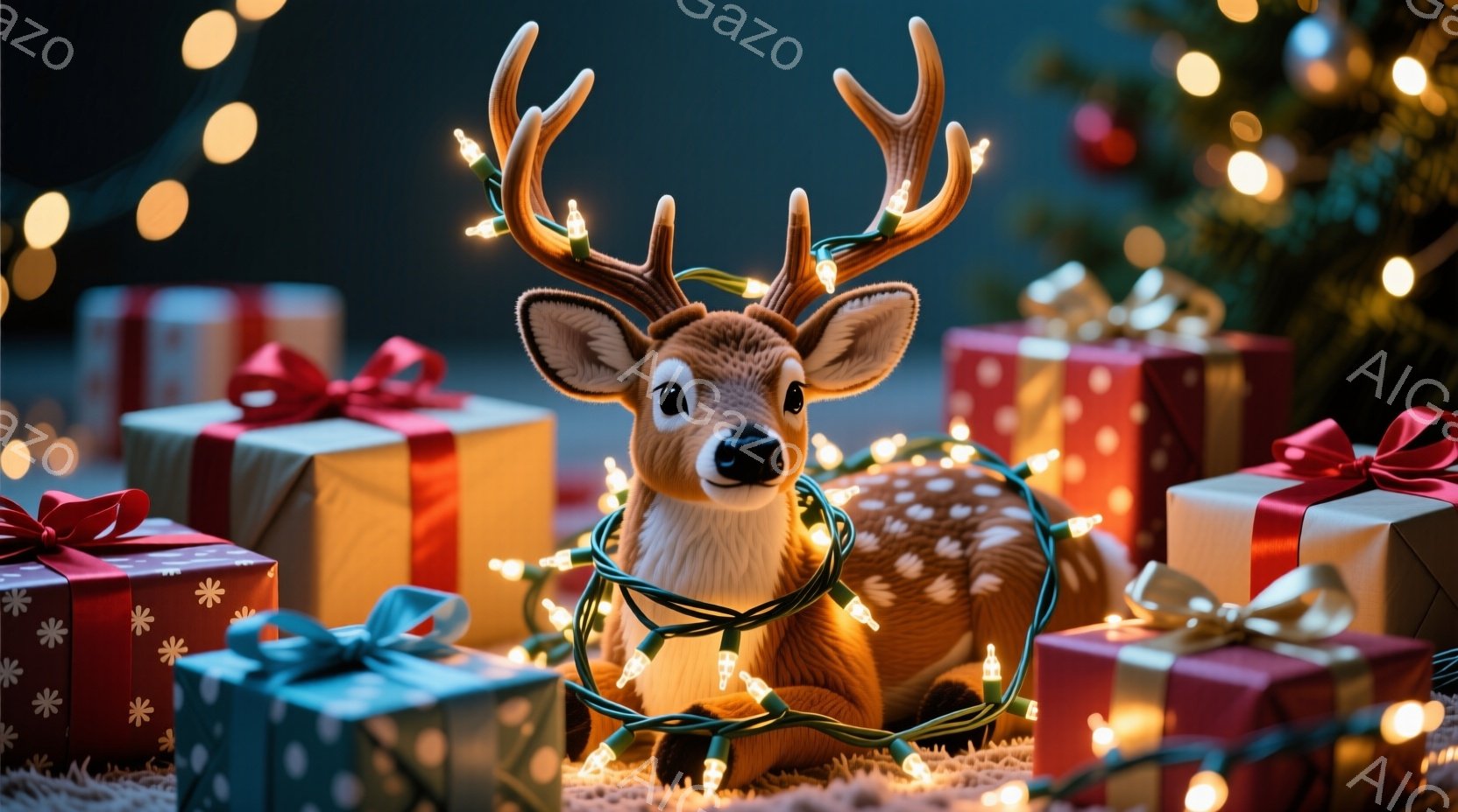 鹿がクリスマスプレゼントに囲まれて横たわっています。暖色のクリスマスライトが鹿の角や体を飾り、お祝いの雰囲気を演出しています。背景には、さまざまな色の包装紙で包まれたギフトボックスが積み重ねられており、暖かく、お祝いのムードが漂っています。