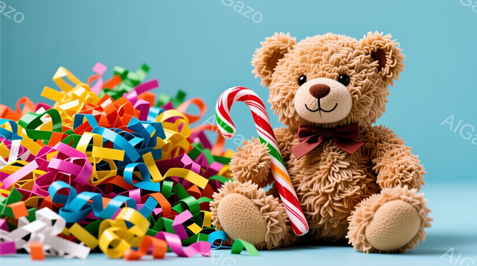 ふわふわの茶色のテディベアが、カラフルな紙吹雪とキャンディケーンに囲まれて座っています。ベアは赤いリボンをつけており、穏やかな表情をしています。背景は明るい色調で、お祝いや楽しい雰囲気を醸し出しています。