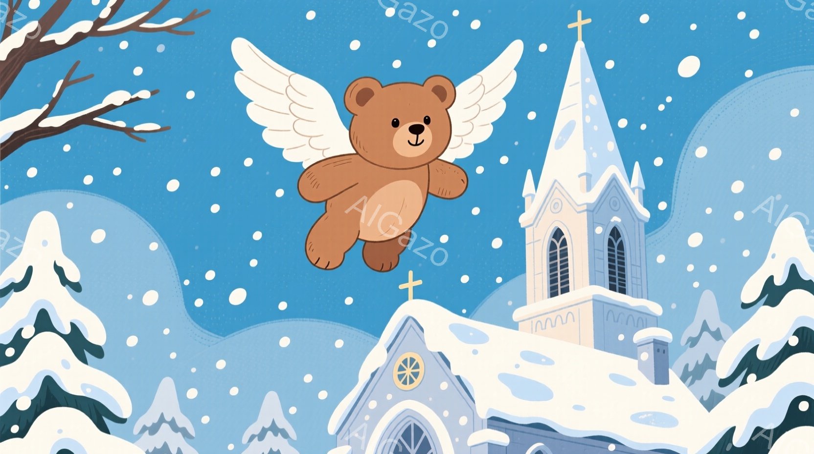 ふっくらとした茶色のフクロウが、レンガ造りの教会の屋根の上にちょこんと座っています。フクロウは大きな黄色い目で前を見据え、少し微笑んでいるように見えます。夜空には無数の星が輝き、教会とフクロウを照らし、幻想的な雰囲気を醸し出しています。