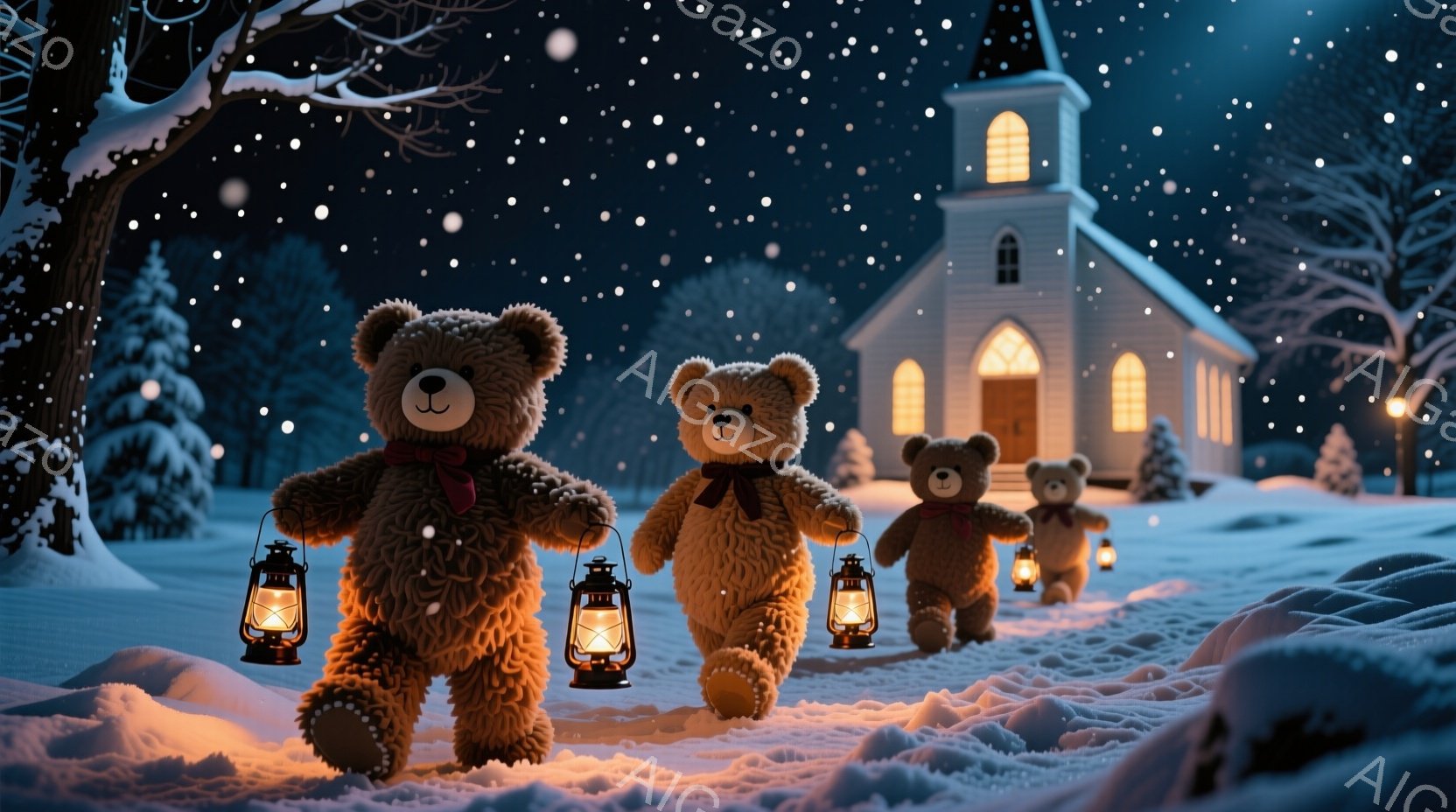 可愛らしいフクロウが、小さな教会の屋根の上に座っています。フクロウは丸い瞳で前を見つめ、穏やかな表情をしています。夜空には無数の光が輝き、教会の窓からは暖かい光が漏れ出し、静かで幻想的な雰囲気を醸し出しています。
