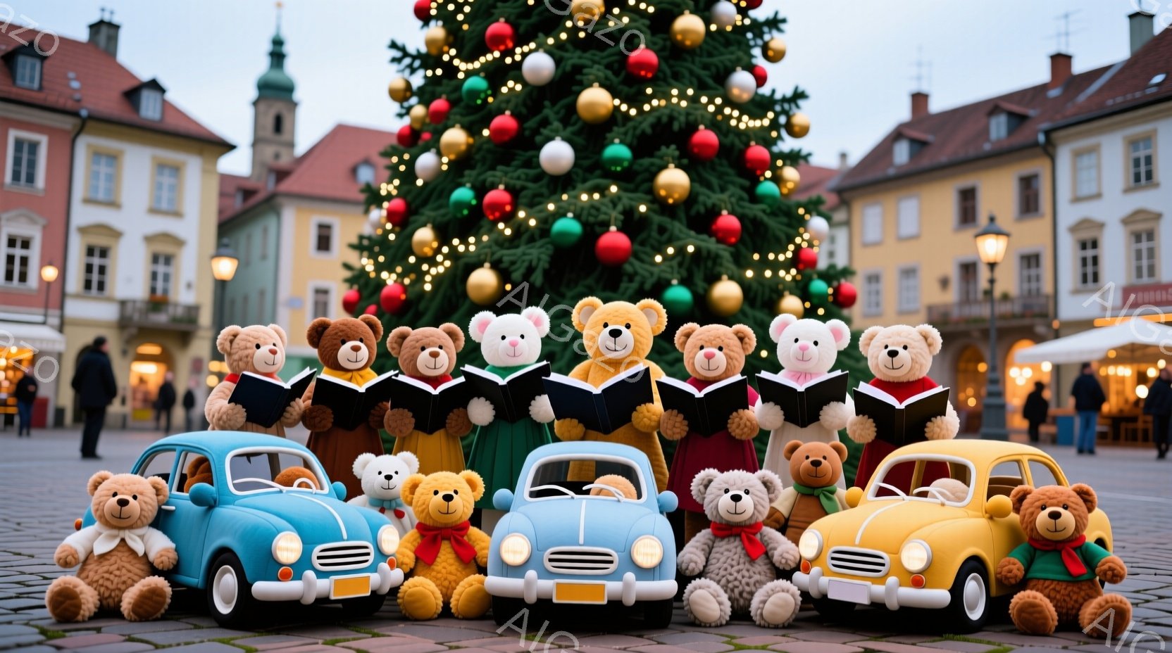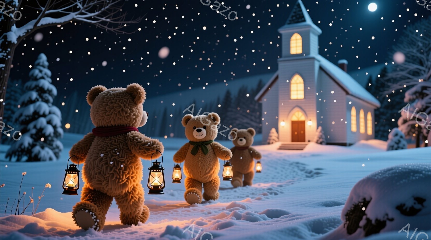 雪景色の中、提灯を持った二匹のテディベアが歩いている。彼らは可愛らしい赤いリボンを首に巻き、暗い雪道に暖かい光を灯している。背景には、雪に覆われた教会の建物があり、冬の静かで幻想的な雰囲気を醸し出している。