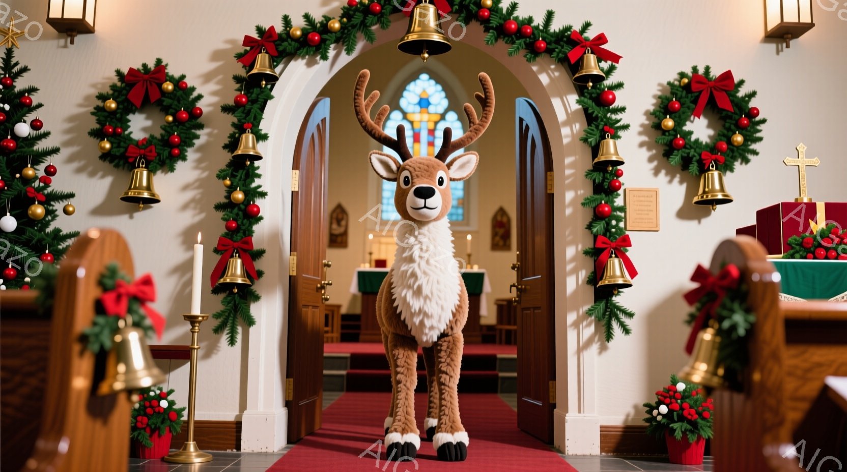 礼拝堂の入り口に、大きなトナカイの着ぐるみが立っている。背景にはステンドグラスの窓が見え、入り口はクリスマスらしい飾り付けで彩られている。全体的に暖かく、お祝いの雰囲気で、まるでクリスマスのイベントの入り口のようだ。