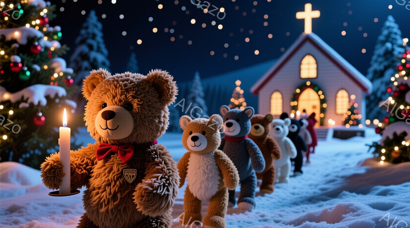 白い羊とクマのぬいぐるみは雪景色の中に横たわっています。羊はリラックスした表情で、クマは赤いリボンを首に結び、頭上に光輪が光っています。背景には藁葺き屋根の小屋があり、中には暖炉の火が灯り、温かい雰囲気が漂っています。