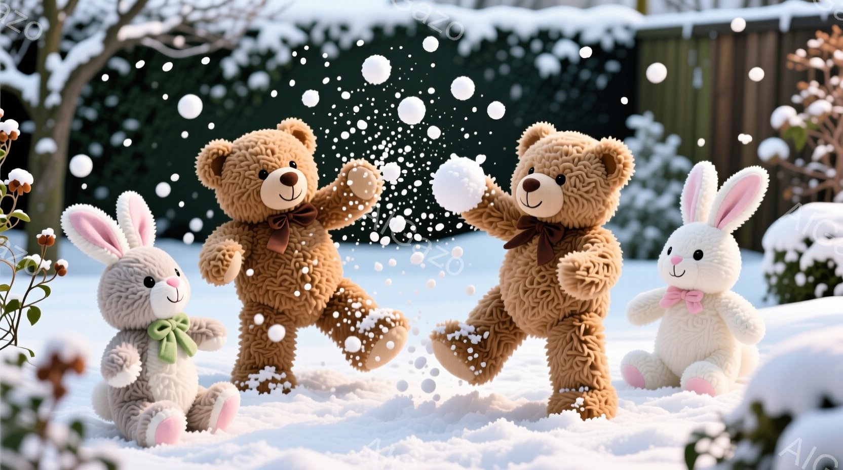 雪景色の中で、二匹のテディベアと二匹のウサギのぬいぐるみたちが雪合戦を楽しんでいる様子が描かれている。クマのぬいぐるみは茶色で、赤いリボンを首に巻いており、楽しそうに雪玉を投げている。ウサギのぬいぐるみは白とグレーで、ピンクのリボンをつけており、雪に覆われた茂みや背景の木々に、冬の穏やかな雰囲気が漂っている。