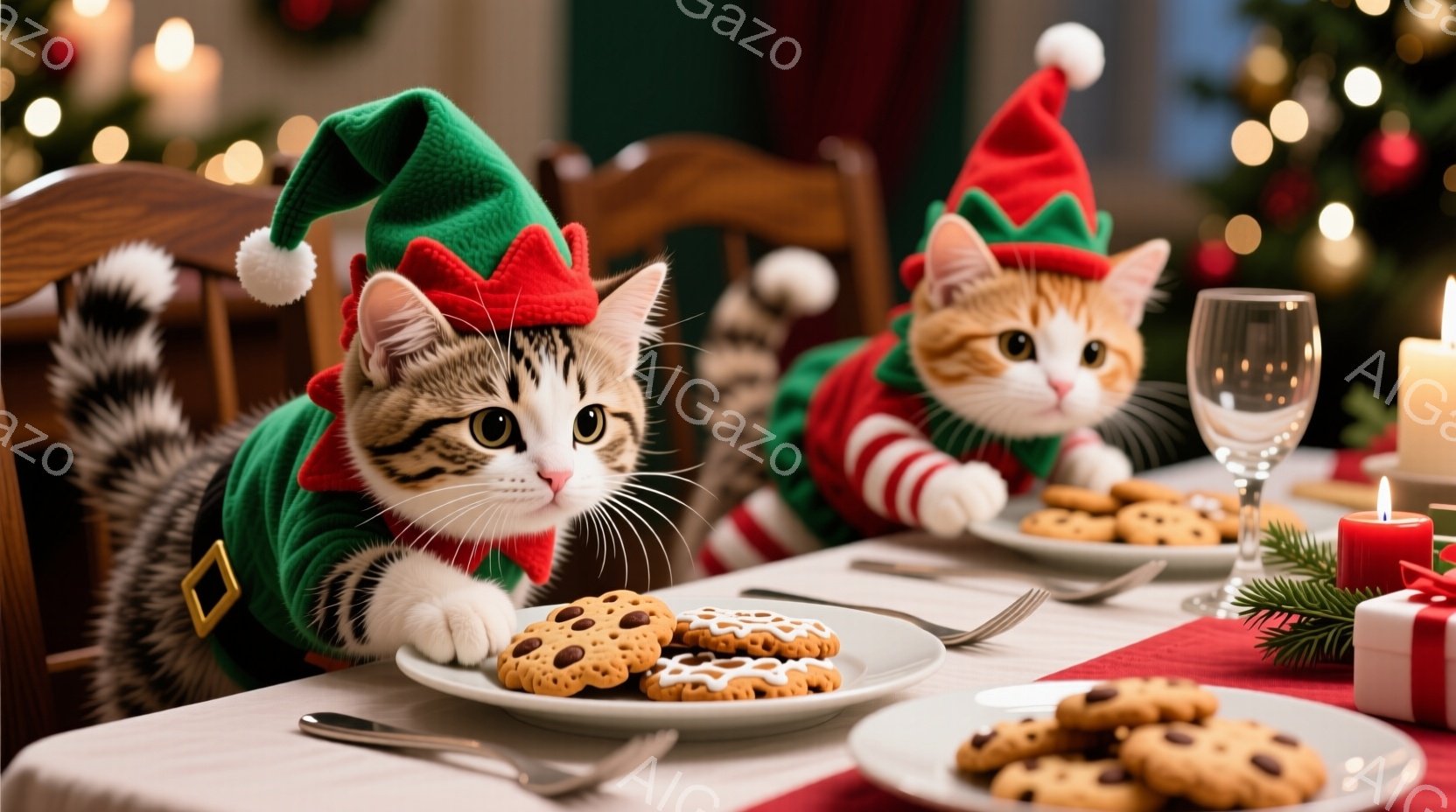 クリスマスをテーマにした猫たちが、緑と赤の妖精の衣装を身につけて食卓を囲んでいる。テーブルの上にはクッキーが並べられ、猫たちはそれを見つめるか、あるいは食べようとしている。背景にはぼやけたクリスマスツリーと装飾が映り、温かく楽しいホリデーシーズンを表現している。