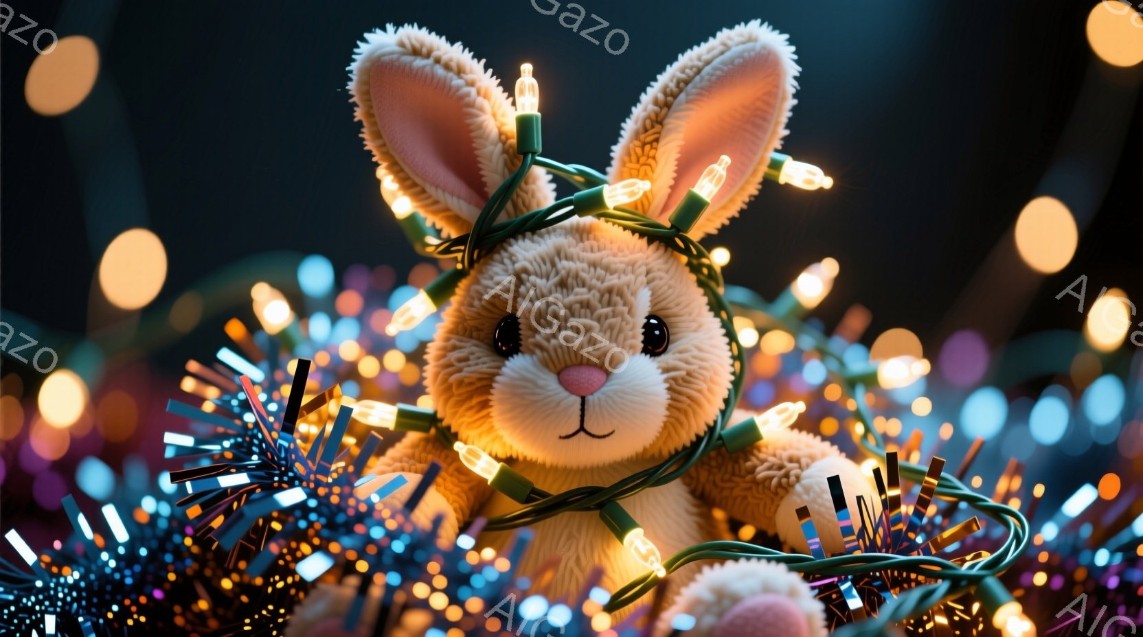 ふわふわの茶色のテディベアのウサギが、青、緑、黄色のクリスマスライトに覆われています。ウサギは正面を向き、愛らしい表情をしています。背景はぼやけており、多くの明るい光点があり、お祝いの雰囲気を作り出しています。