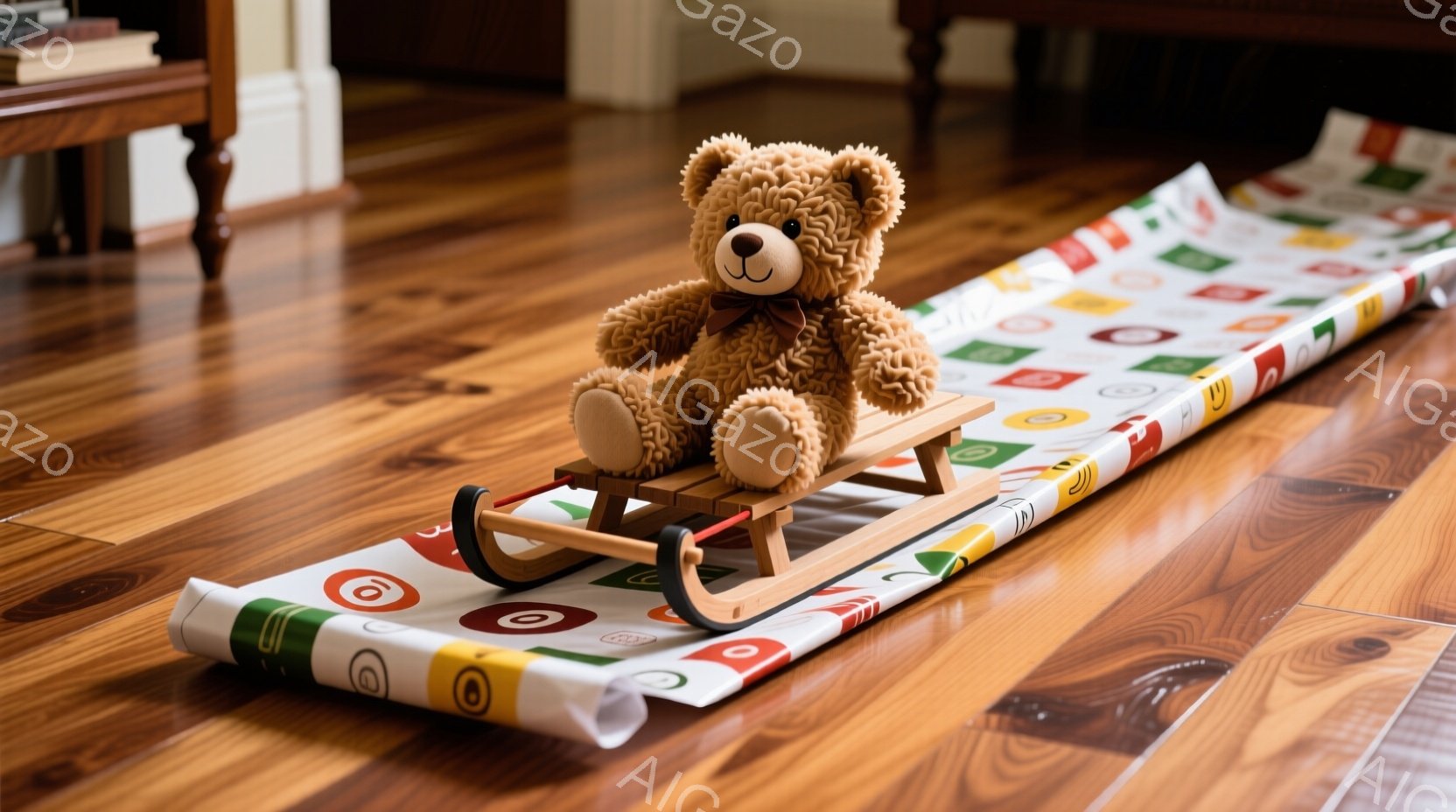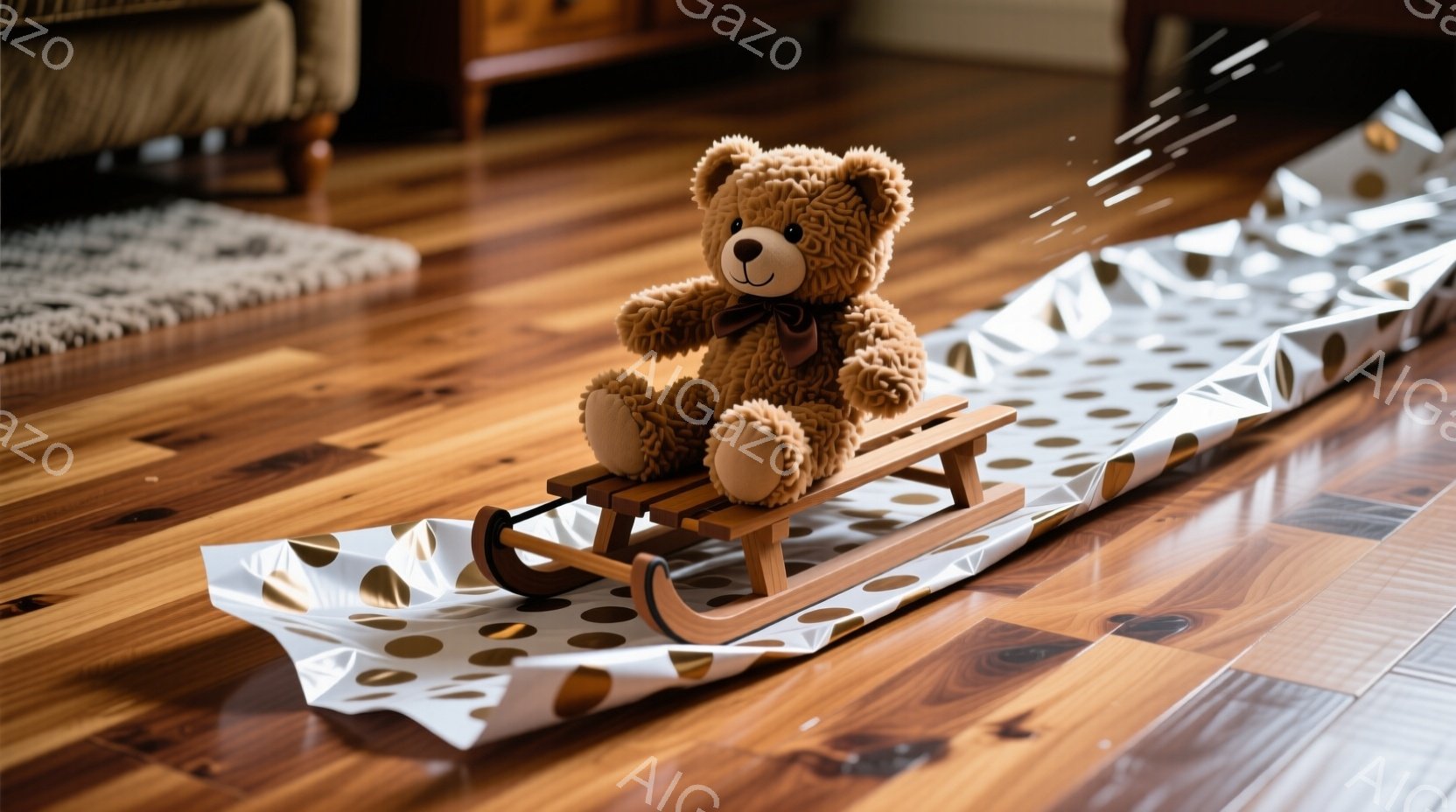 茶色のテディベアが木製のそりに乗って滑っている様子が写っています。背景は木製の床で、そりの後ろにはカラフルな包装紙が巻き広がっています。全体的に暖かく、遊び心のある雰囲気です。