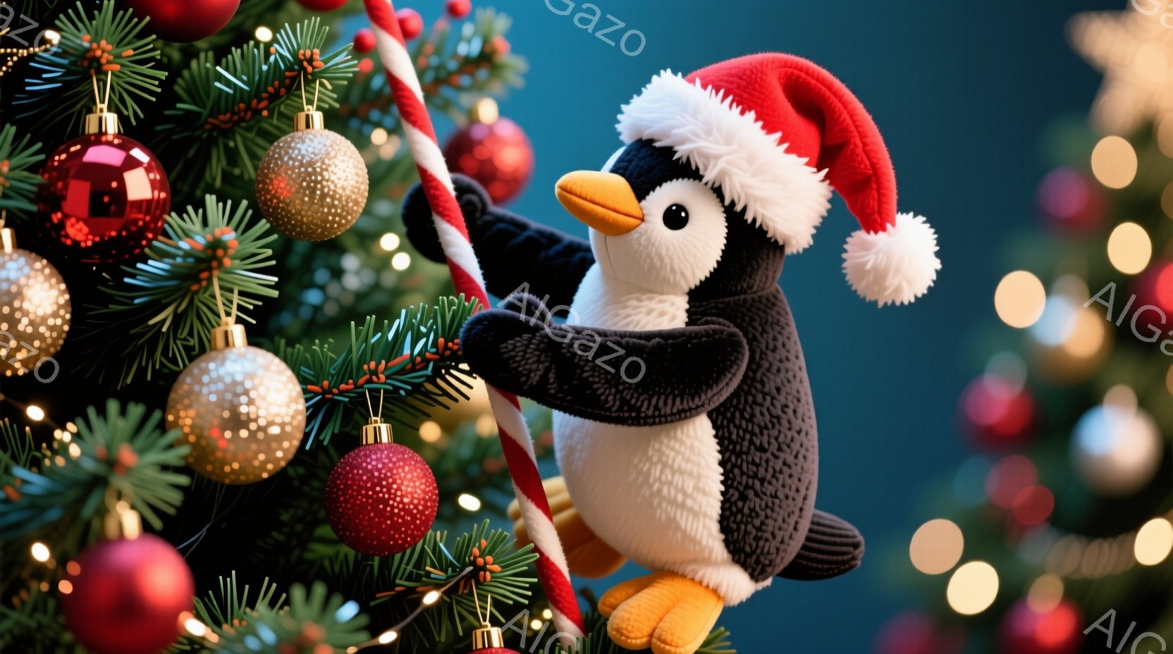 2匹のペンギンがクリスマスツリーの枝にしがみつき、赤いサンタ帽をかぶっています。ペンギンたちは愛らしい表情で、お互いに寄り添うように配置されています。背景には緑色の木々と様々なオーナメントが飾られたクリスマスツリーがあり、暖かく、お祝いムードに満ちた雰囲気です。
