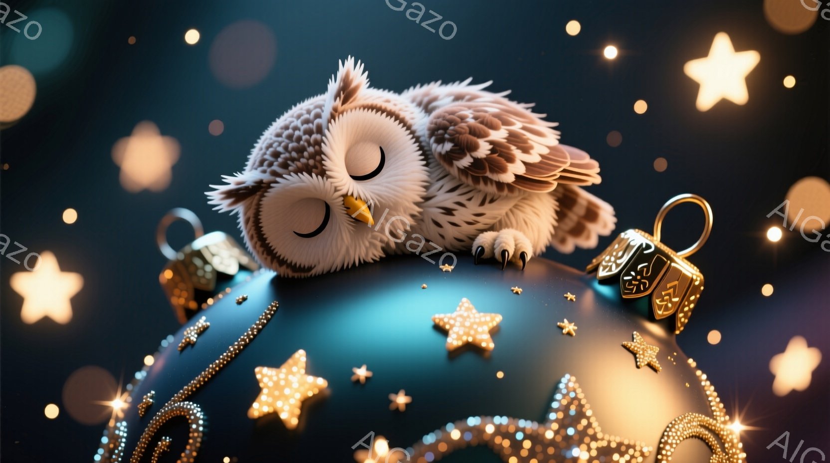 深い青色のクリスマスオーナメントの上に、ふわふわの白いフクロウが丸まって眠っています。フクロウは目を閉じ、穏やかな表情を浮かべており、背景にはキラキラと輝く星のような光が散りばめられています。全体的に、暖かく幻想的な雰囲気で、冬の夜の静けさを表現しているようです。