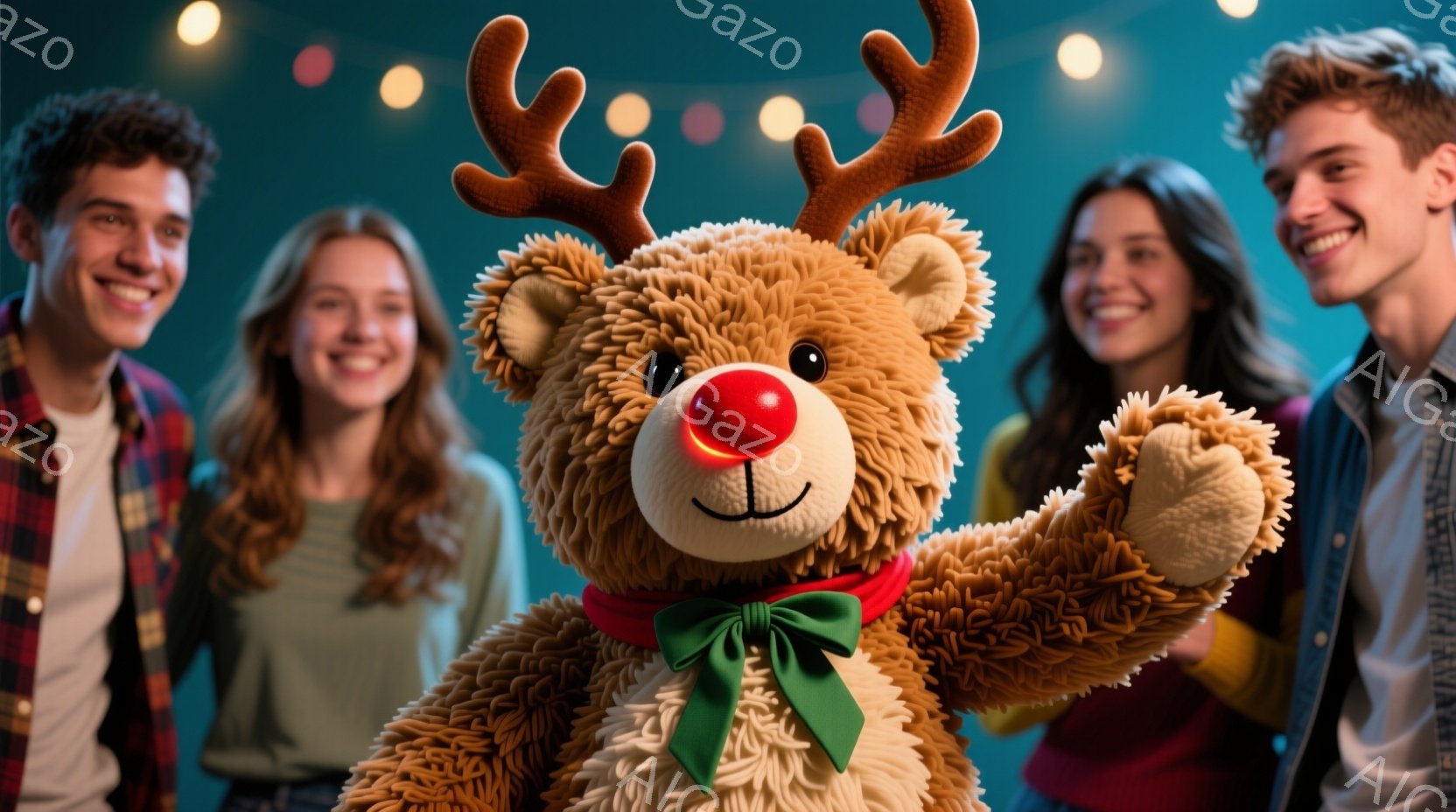 暖炉の光の中で、トナカイの角と赤い鼻を持つテディベアが、緑色のリボンを首に巻き、片手を上げています。背景には、笑顔で楽しんでいる若い男女が数人見え、温かく幸せな雰囲気が漂っています。ぼやけた背景には、キラキラ光るホリデーデコレーションがいくつか見え、お祝いの雰囲気です。