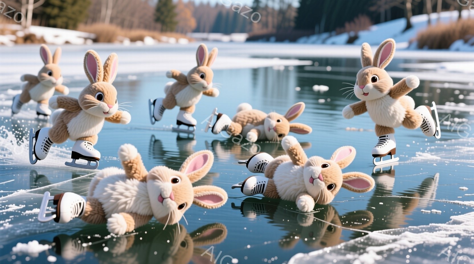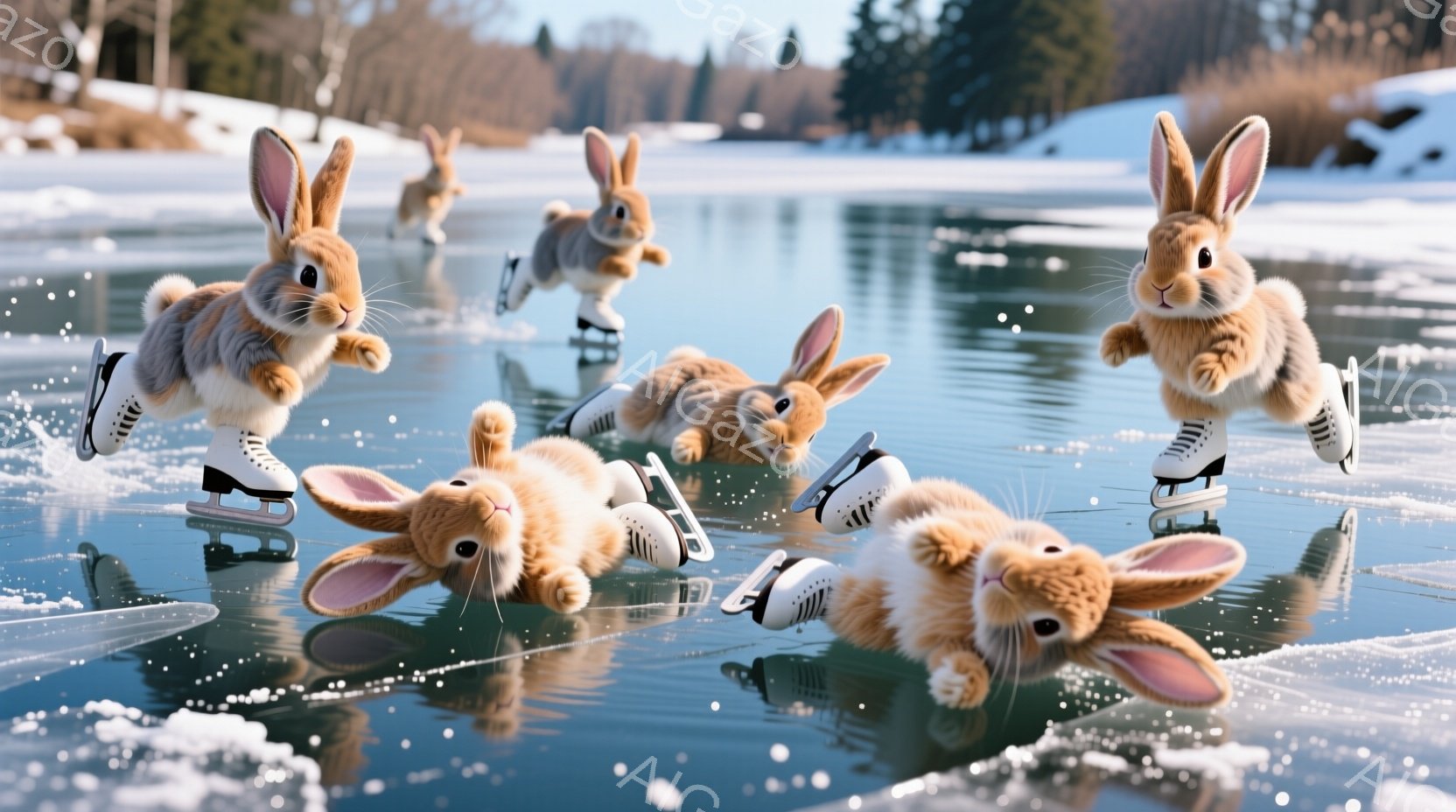 凍った湖の上で、スケート靴を履いたウサギたちが楽しそうに滑っている様子が描かれている。ウサギたちは様々なポーズで滑っており、楽しげな表情をしているように見える。背景には雪景色が広がり、晴れた空と氷のコントラストが美しい、冬の日の活気ある光景だ。