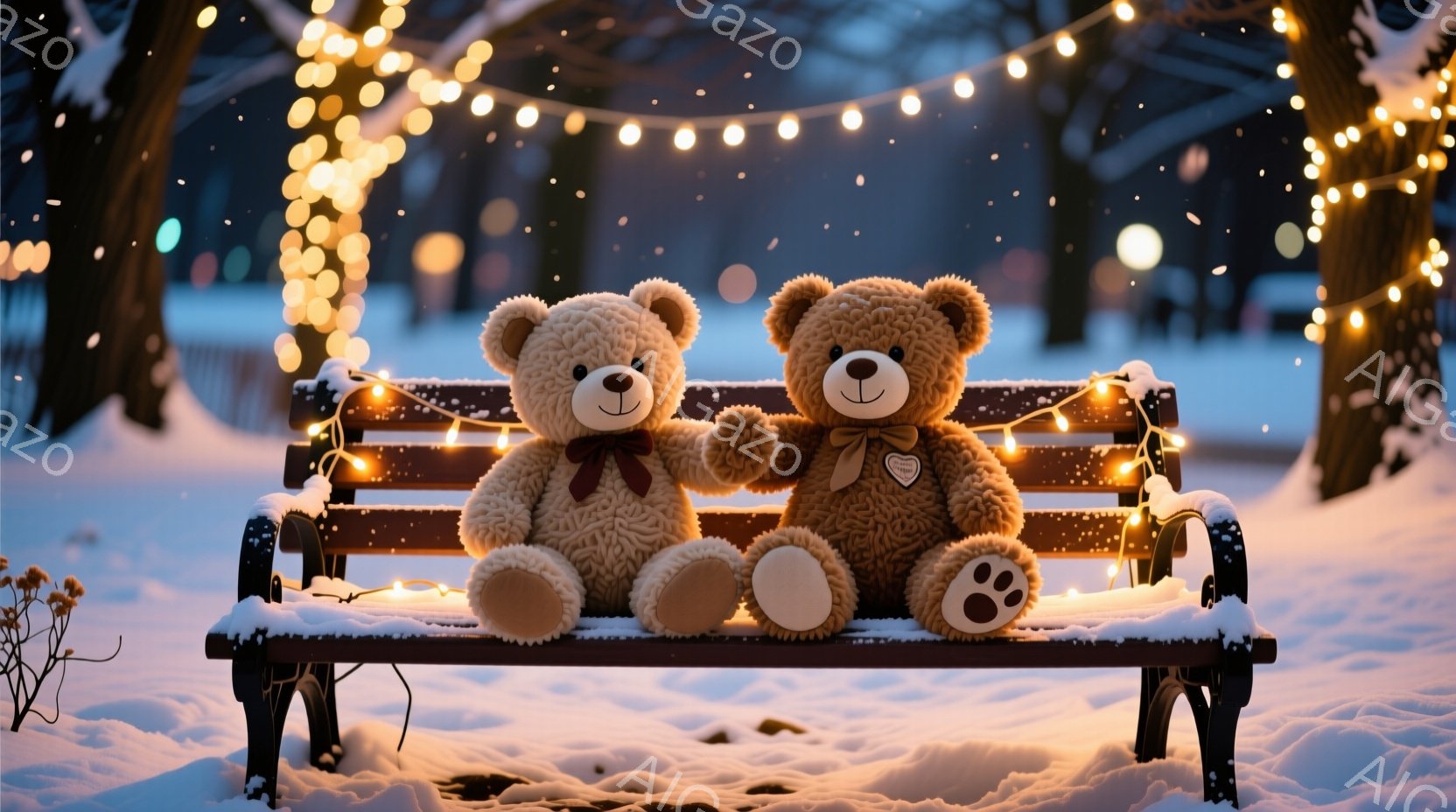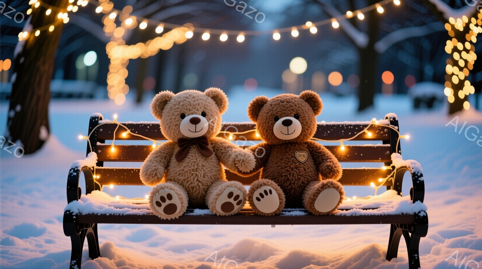 雪が降り積もった公園のベンチに、茶色のテディベアが寄り添って座っています。一匹は赤いリボン、もう一匹は茶色のリボンを首に巻いており、優しい表情で互いを見つめています。背景には、ぼんやりと見える建物と、温かい光を放つ電飾が飾られた木々があり、ロマンチックで穏やかな雰囲気を醸し出しています。