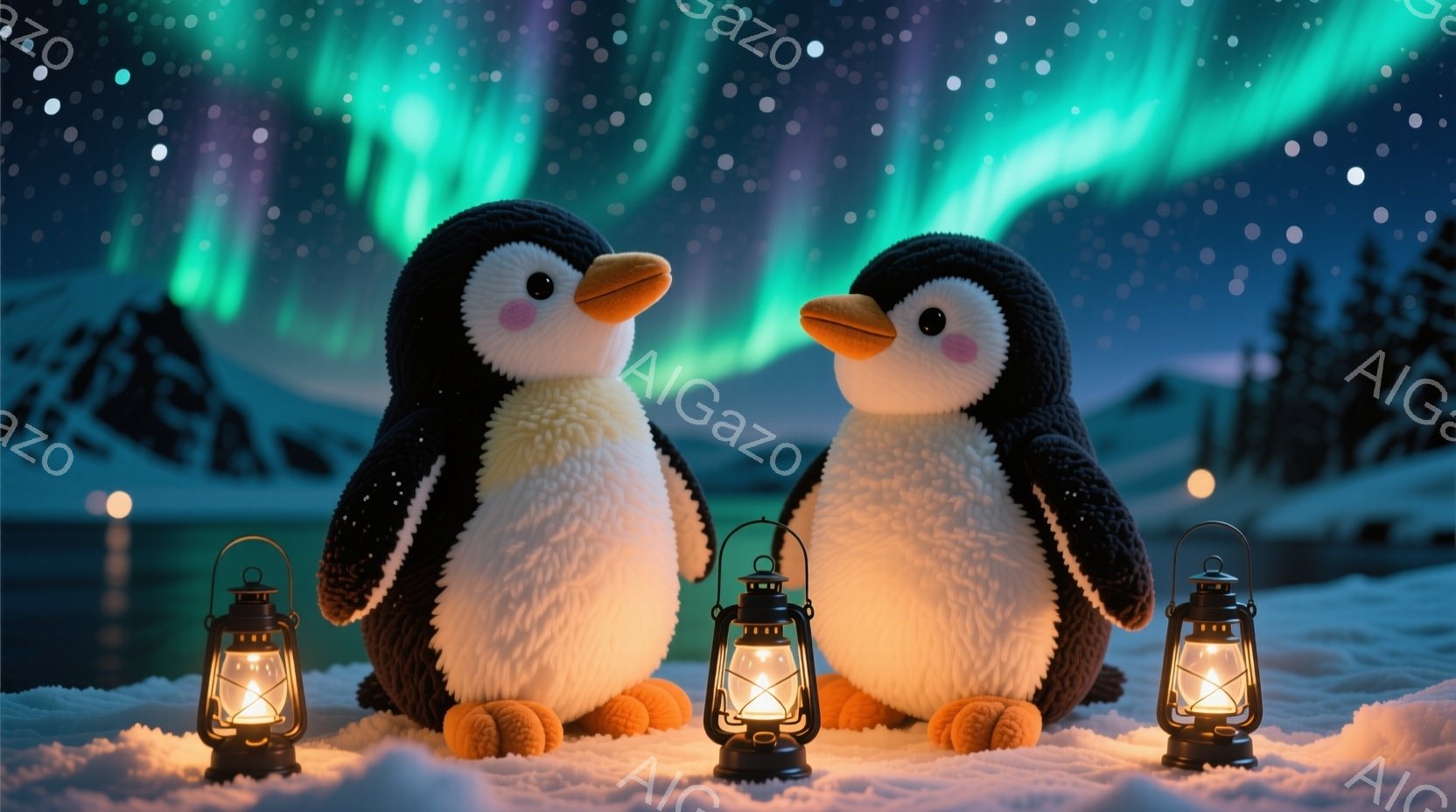 雪景色の中に、二羽のペンギンが寄り添って座っています。ペンギンたちは黒と白の体にオレンジ色の足を持ち、丸い体とつぶらな瞳が可愛らしい表情をしています。背景にはオーロラが輝き、雪原には暖色のランタンが灯っており、幻想的で温かい雰囲気を醸し出しています。