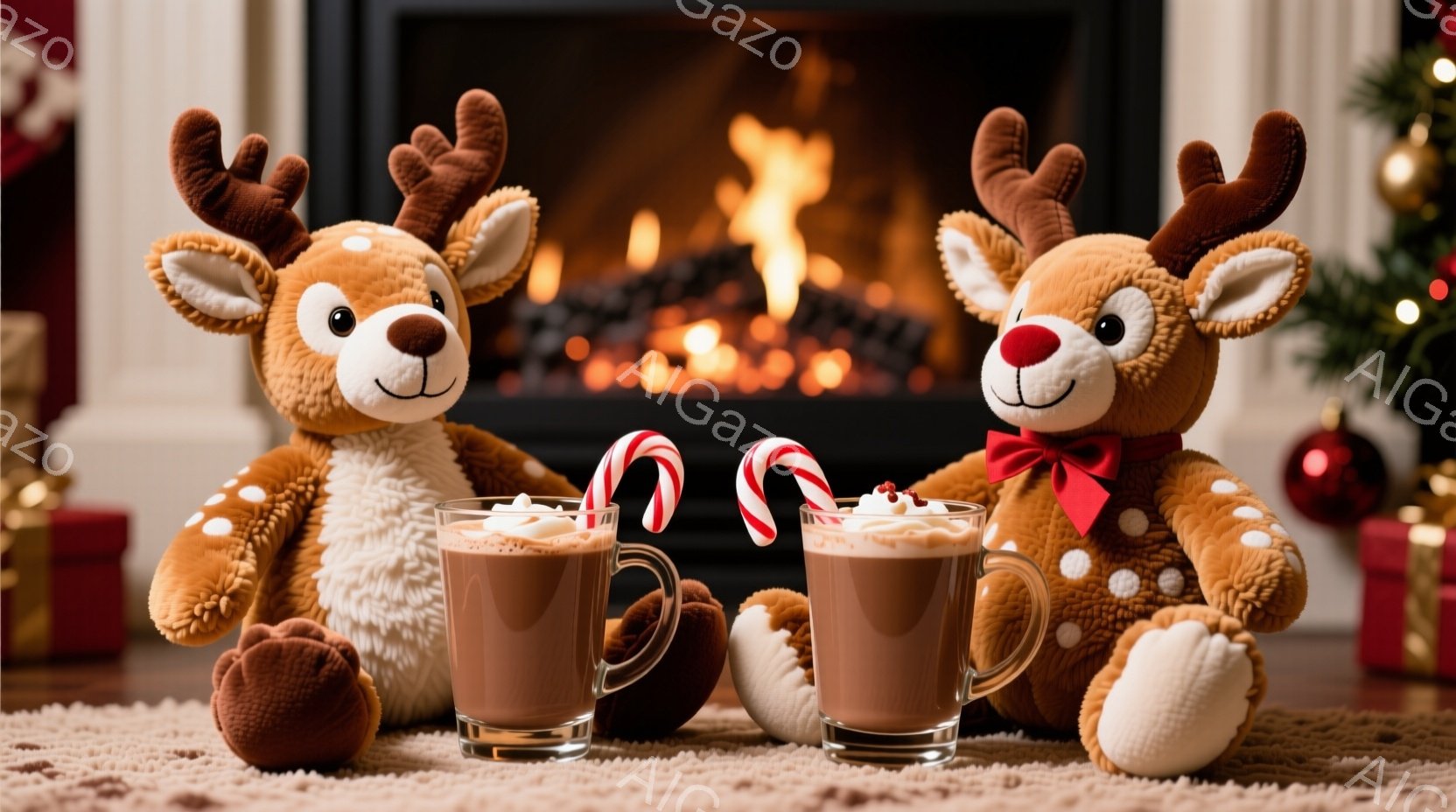 2匹のふわふわしたトナカイのぬいぐるみは、ホットココアの入ったグラスを手に、木製の床に座っています。背景には暖炉があり、炎が燃え盛っており、クリスマスの装飾やプレゼントが置かれています。全体的に、暖かく、居心地の良い、お祝いの雰囲気です。
