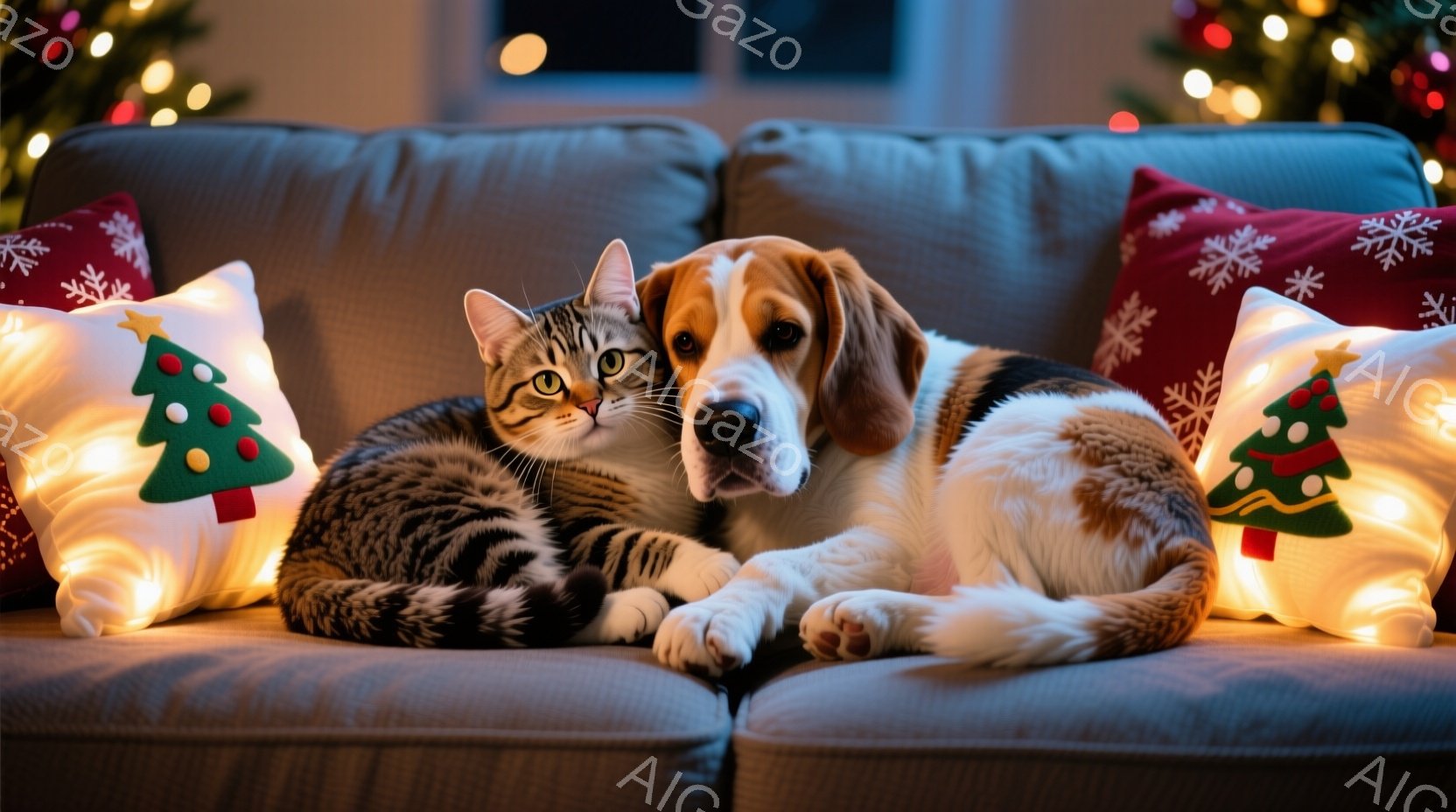 ソファに猫と犬が寄り添って横たわっています。猫は縞模様でリラックスした表情を浮かべ、犬は明るい毛並みで、穏やかな視線を向けています。背景にはクリスマスツリーの光がぼんやりと見え、クッションもクリスマス柄で、暖かく心地よい雰囲気が漂っています。