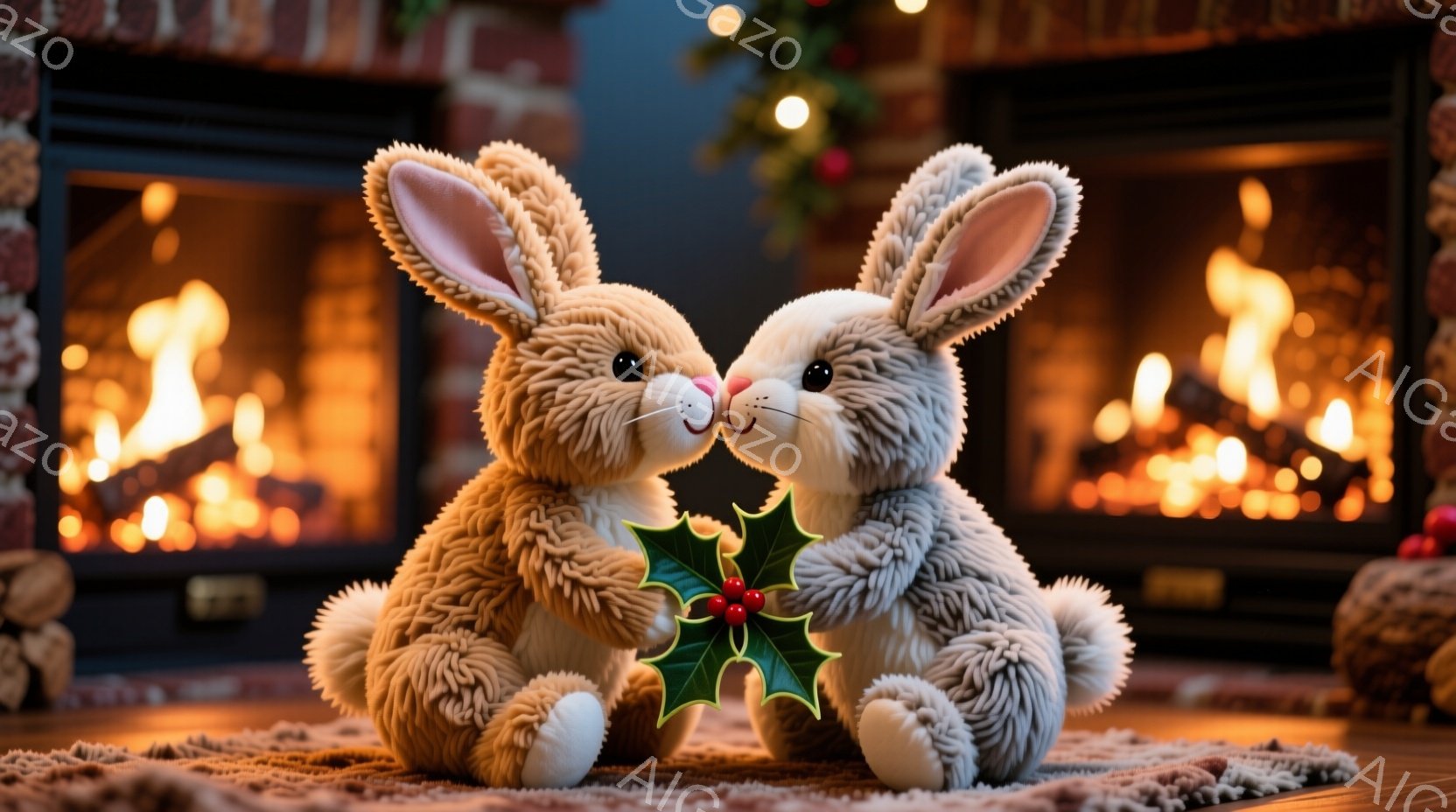 暖炉の前で寄り添う、ふわふわの白いウサギのペアが描かれています。ウサギたちは、ホリーの葉と実を前に、鼻先をくっつけ合って愛情を表現しています。背景には、クリスマスツリーや本棚が見え、暖炉の炎が温かい雰囲気を醸し出しています。