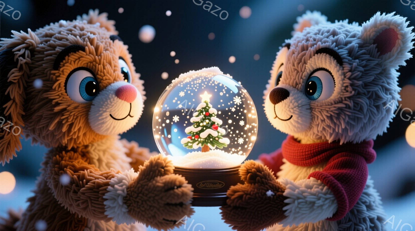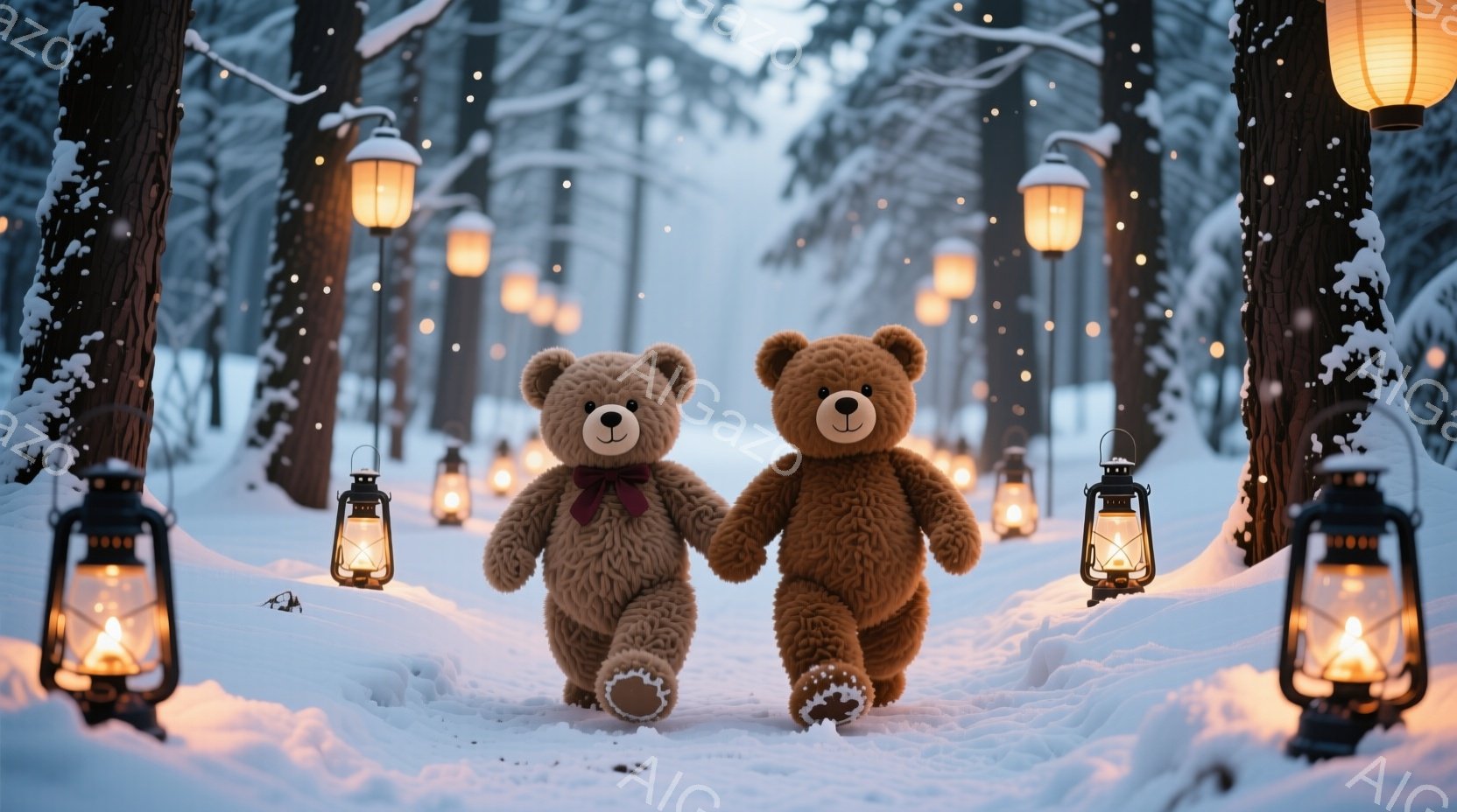 ふわふわの茶色のテディベアが二人、雪の積もった森の中を並んで歩いています。一匹は赤いリボンをつけており、もう一匹はリボンなしで、どちらも優しい表情をしています。背景には雪の降る森と、灯りを灯したランタンが並び、暖かく幻想的な雰囲気が漂っています。