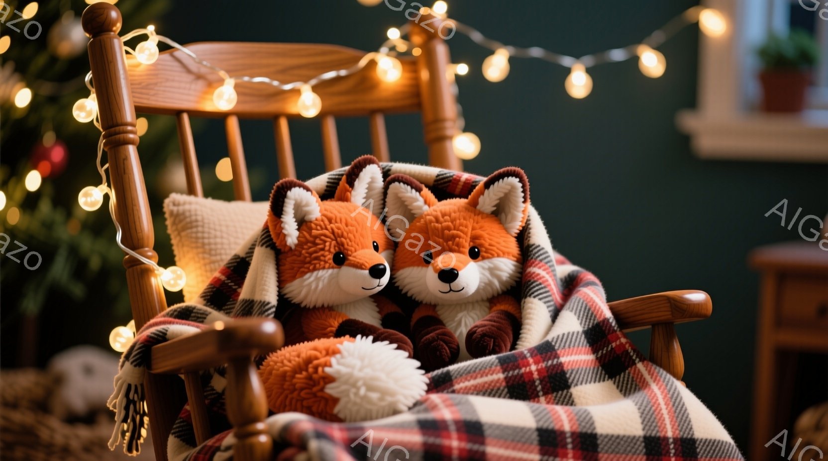 温かい光に包まれたロッキングチェアに、2匹のふわふわしたオレンジ色のキツネのぬいぐるみがお互いに寄り添って座っています。ロッキングチェアには赤と黒のチェック柄のブランケットが掛けられており、背景にはクリスマスの飾りや植物が見え、冬の穏やかで心地よい雰囲気が漂っています。暖炉や壁に飾られた写真が、このシーンに温かさと親密さを加えています。