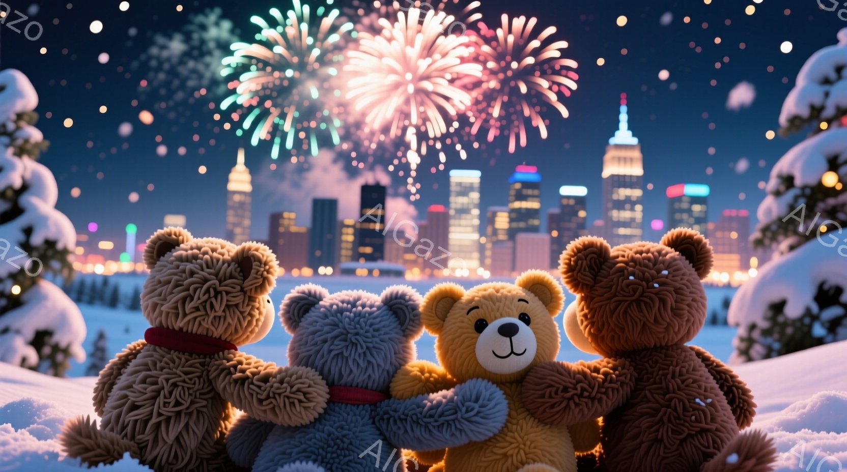 雪景色の中に、四匹のテディベアが寄り添って座っています。彼らは背を向けているため表情は見えませんが、暖かく親密な雰囲気が伝わってきます。背景にはニューヨークの摩天楼が輝き、夜空には盛大な花火が打ち上げられています。