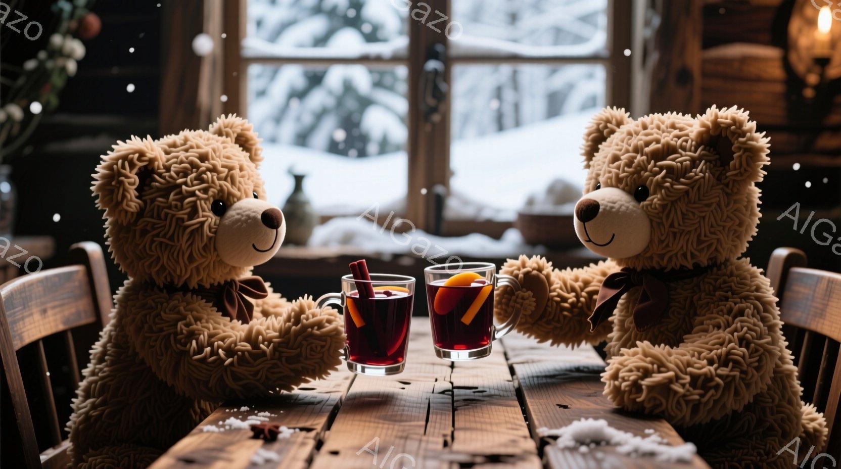 2匹のテディベアが、暖炉の光が差し込む木のテーブルを挟んで向かい合って座っており、それぞれ首に赤いリボンをつけている。テーブルの上には、湯気を立てる赤い飲み物が入ったマグカップが置かれており、冬の雪景色を背景に、温かく居心地の良い雰囲気を醸し出している。暖炉の光と雪景色が、静かで穏やかな冬の日のひとコマを表現している。