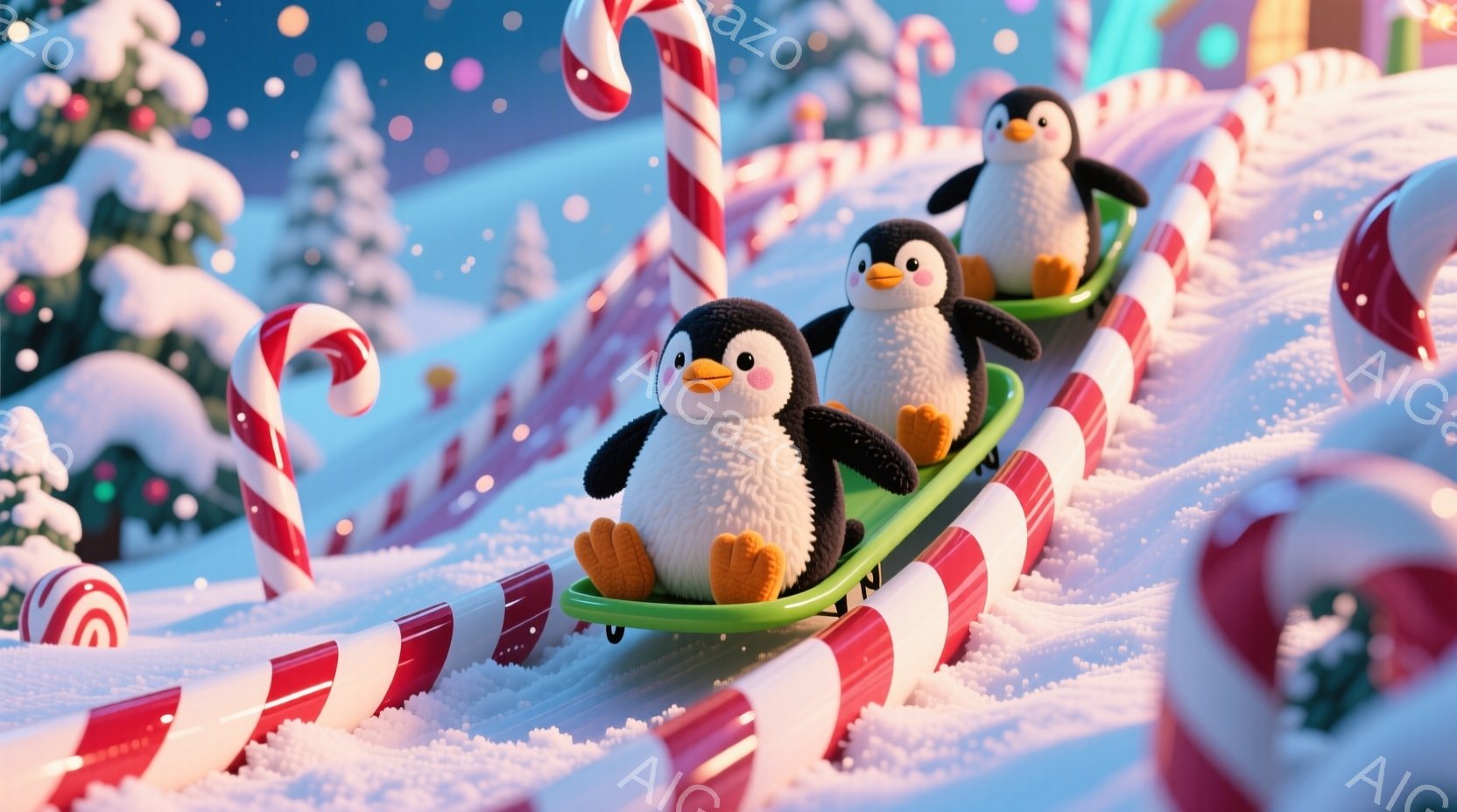 雪景色の中でそりを楽しんでいるペンギンのイラストが描かれています。ペンギンたちは赤いそりに乗り、笑顔で滑っており、その周囲にはキャンディケーンや雪で覆われた木々が見られます。背景は雪の降る冬の風景で、全体的に暖かく、楽しい雰囲気が漂っています。
