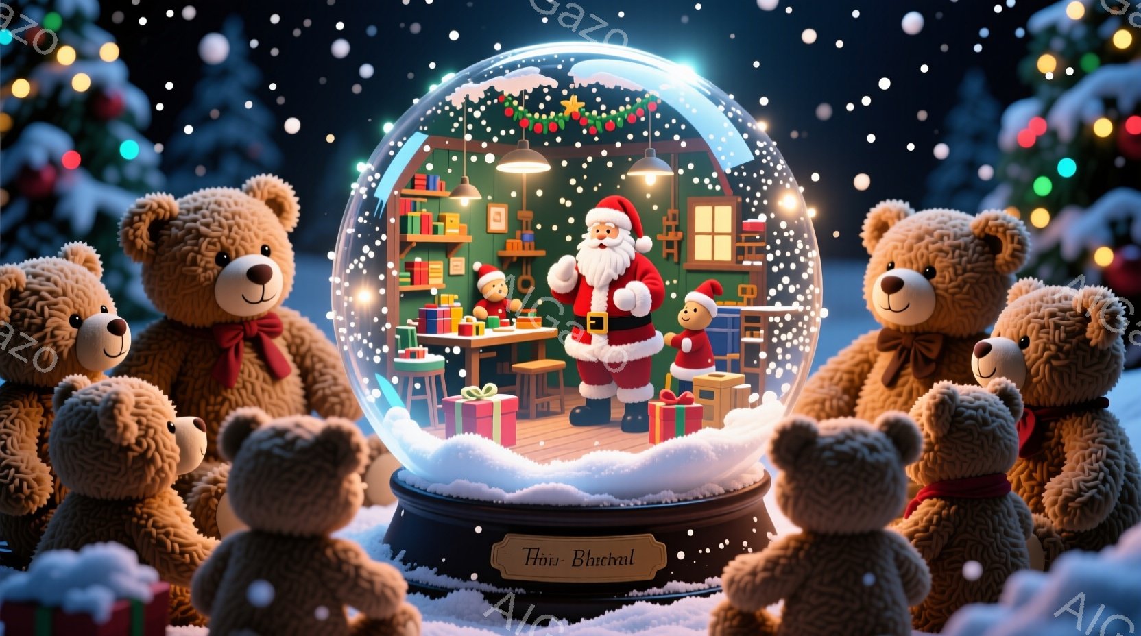 雪が舞う中で、クリスマスの人形が雪球の中に配置されています。雪球の中には、おもちゃの工房があり、サンタクロースが赤い服を着て立っており、工房内にはおもちゃや道具が整然と並んでいます。温かみのある光が工房全体を照らし、クリスマスの魔法のような雰囲気を醸し出しています。