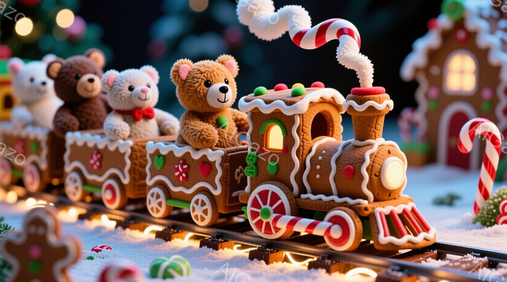チョコレート色のジンジャーブレッド列車が雪景色の中に走っています。列車にはふわふわのテディベアが乗り、一番前の車両には赤いリボンをつけたクマ、後ろの車両には別のクマが乗っています。背景にはぼやけたクリスマスツリーと、キャンディケーンが散りばめられ、暖かい祝祭の雰囲気を醸し出しています。