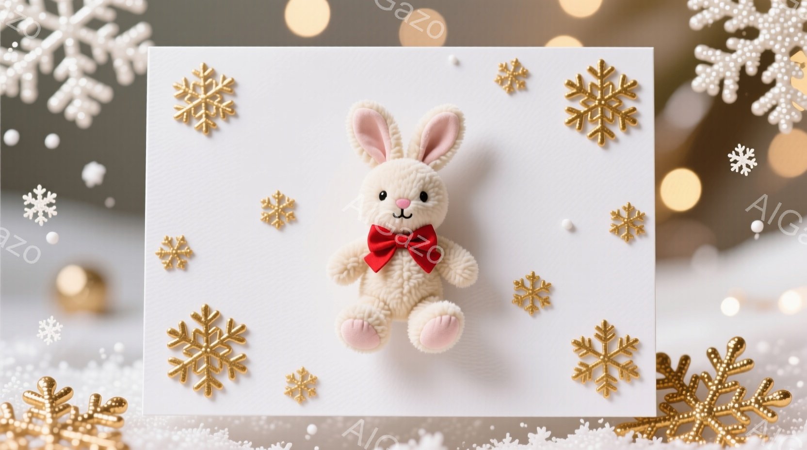 白い背景に、ピンクの耳と足を持つふわふわの白いウサギのぬいぐるみがあります。赤いリボンを結んでおり、可愛らしい表情をしています。背景には金色の雪の結晶が散りばめられており、冬の暖かく穏やかな雰囲気を醸し出しています。