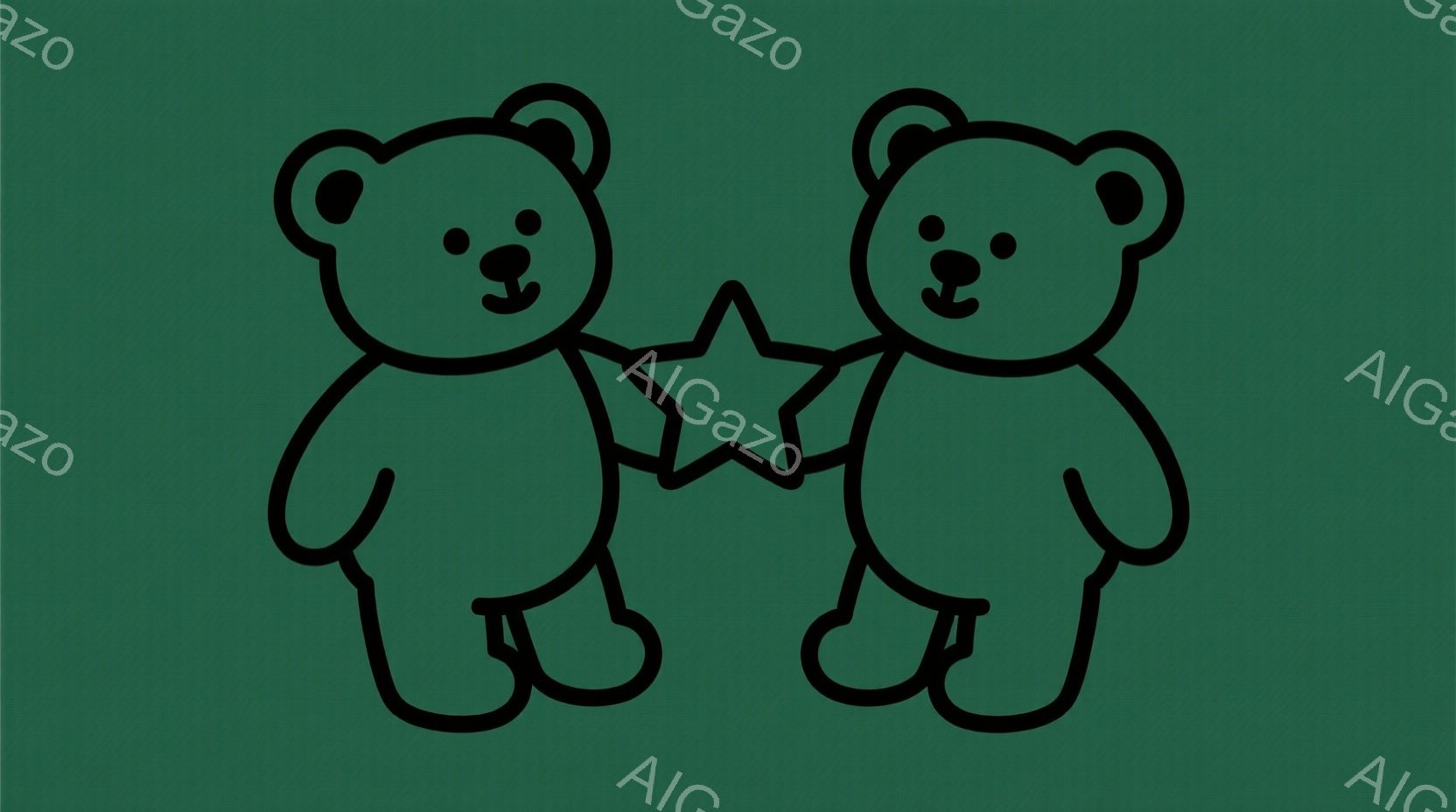 2匹のテディベアが正面を向き、星形のオブジェクトを両手で抱え合っています。ベアは単純な輪郭線で描かれており、可愛らしい表情をしています。背景は鮮やかな緑色で、全体的に温かく、愛らしい雰囲気です。