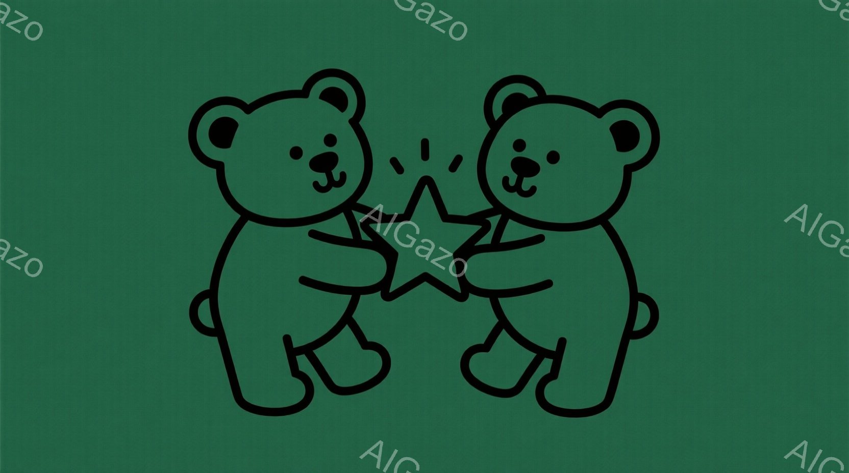 2匹のクマが星形のオブジェクトを抱え合っているシンプルなイラストです。クマたちは輪郭だけで描かれており、表情は示されていませんが、寄り添う様子から温かい雰囲気が伝わってきます。背景は単色の濃い緑色で、他に建物や自然といった要素はありません。
