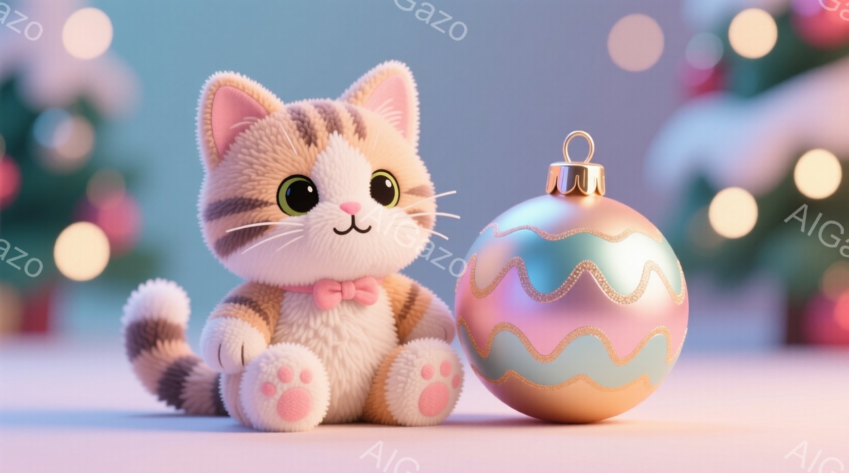ふわふわとしたオレンジ色の猫のぬいぐるみは、水色の蝶ネクタイをつけて座っています。ピンク色の肉球が可愛らしく、大きな瞳で優しげな表情をしています。背景にはぼやけた光の球と、雪をかぶった小さな家が見え、クリスマスの温かく幻想的な雰囲気を醸し出しています。
