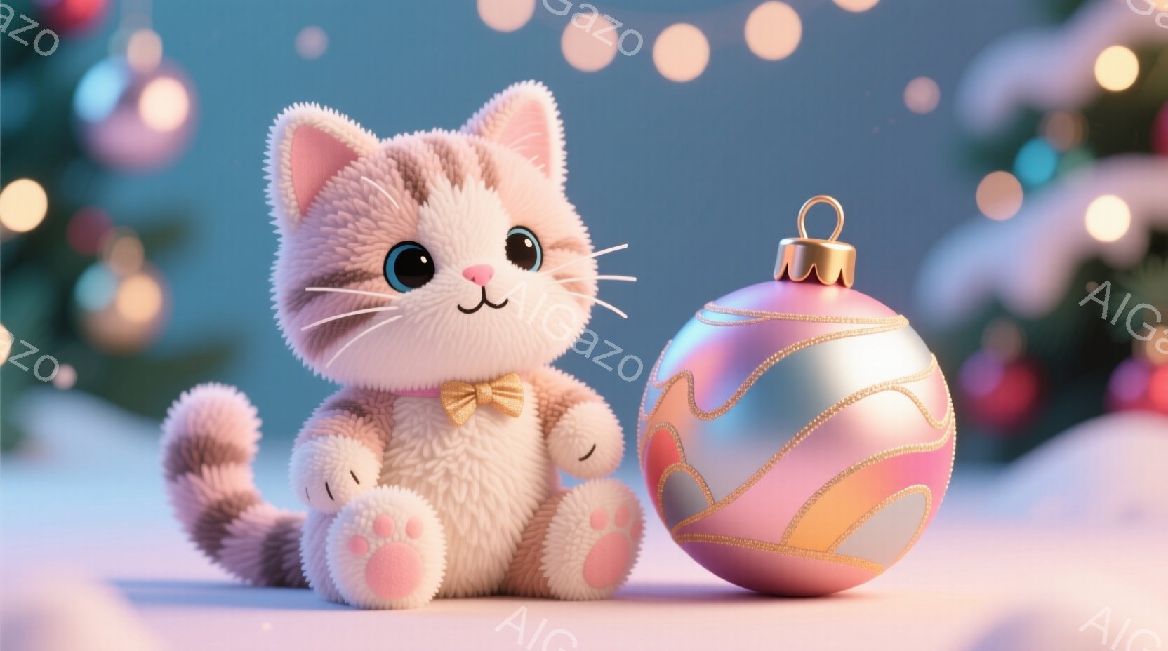愛らしい子猫が、ピンクのリボンを首につけて座っており、大きな丸いオーナメントの横に寄り添っています。背景にはぼやけたクリスマスツリーと、柔らかい光のぼかしがあり、全体的に温かく、お祝いムードの漂う雰囲気です。子猫の表情は穏やかで、可愛らしいポーズがより一層その魅力を引き立てています。
