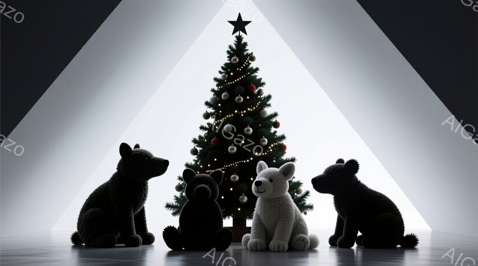 クリスマスの背景を前に、黒、黒、白、茶色の4匹のテディベアが座っています。背景には緑色のクリスマスツリーがあり、カラフルな電飾で飾られ、上には星が輝いています。全体的に柔らかく温かい雰囲気で、心地よいクリスマスの情景が表現されています。